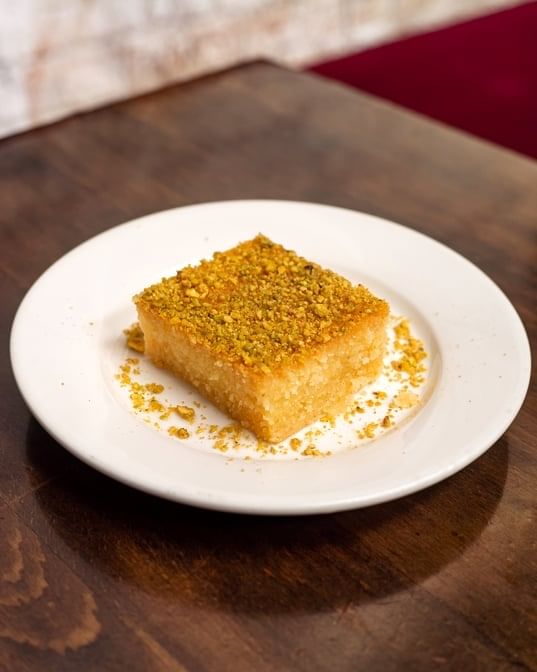 Semolina cake with yogurt, almonds, and walnuts drizzled in Moroccan honey