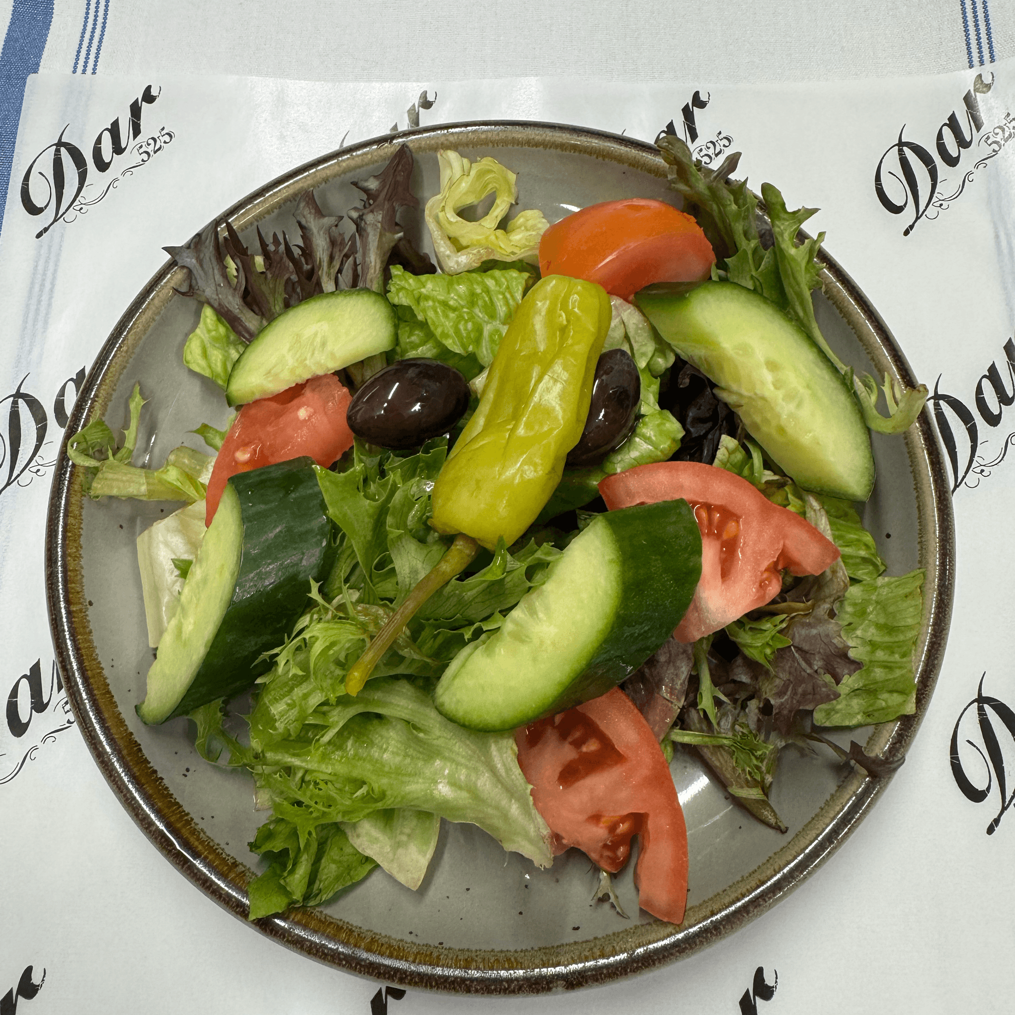 Lettuce, tomatoes, capers, mushrooms, cucumber, artichoke, black olives, parsley, feta cheese, lemon juice, and olive oil. Served with fresh pita bread