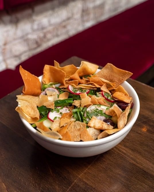 Lettuce, cucumber, plum tomato, parsley, mint, sumac, green pepper, toasted pita chips, lemon juice, and olive oil