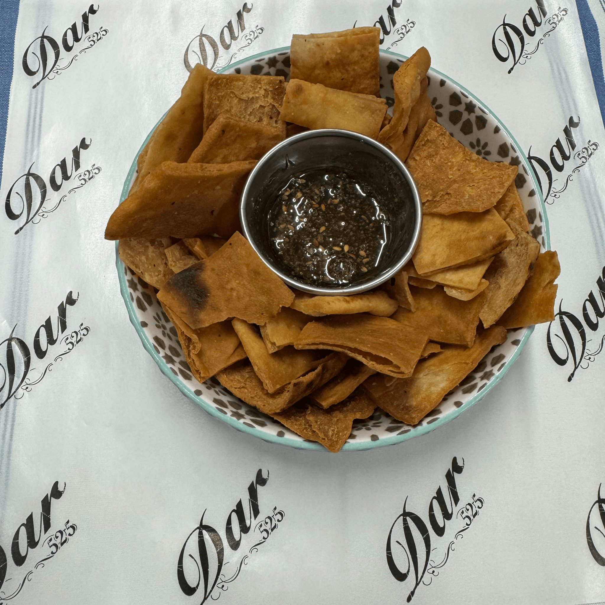 Homemade pita chips with two sides of zaatar honey