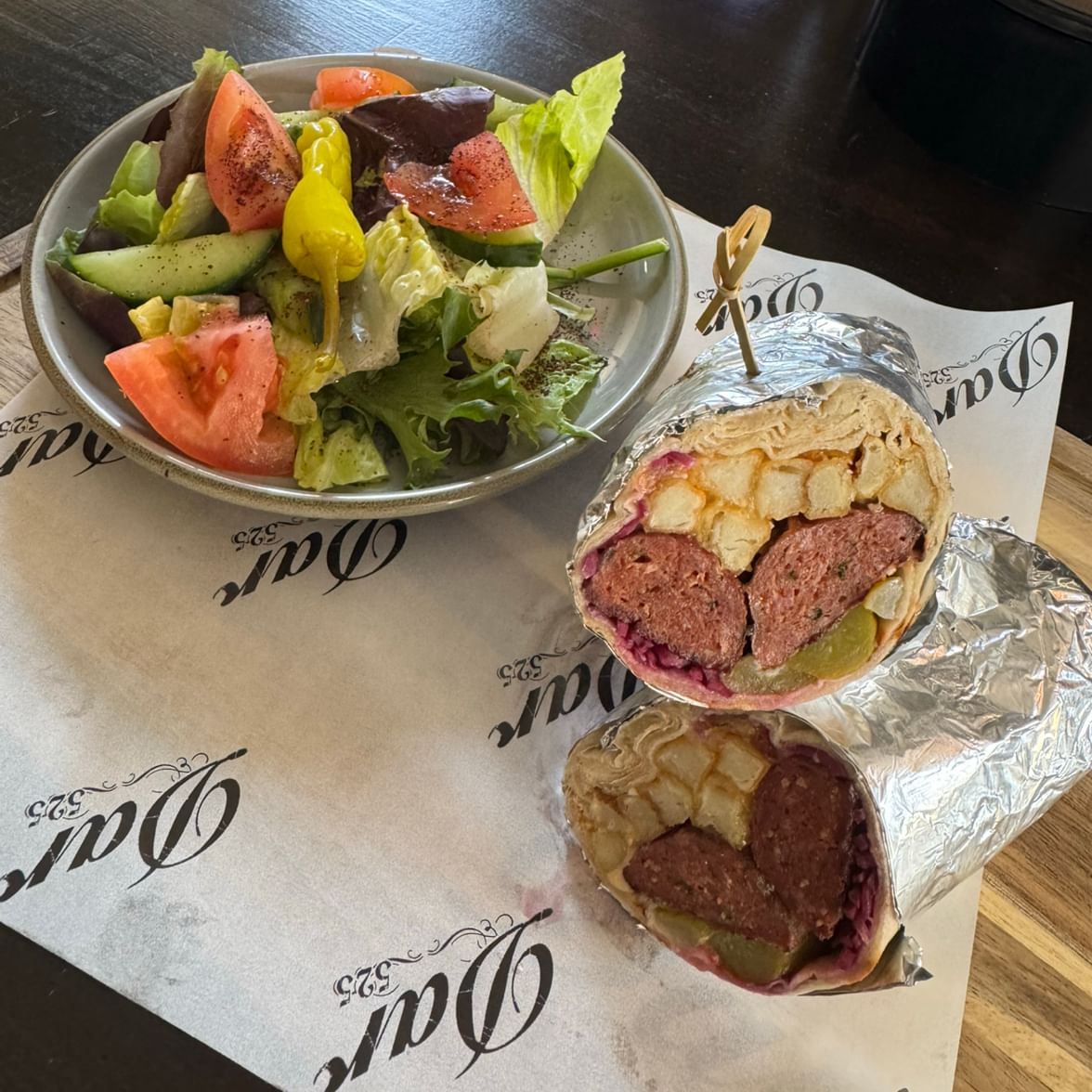 Mixed greens, dates, and tomatoes. Mint, cucumbers, and green peppers. Drizzled with Zaatar and carrot vinaigrette