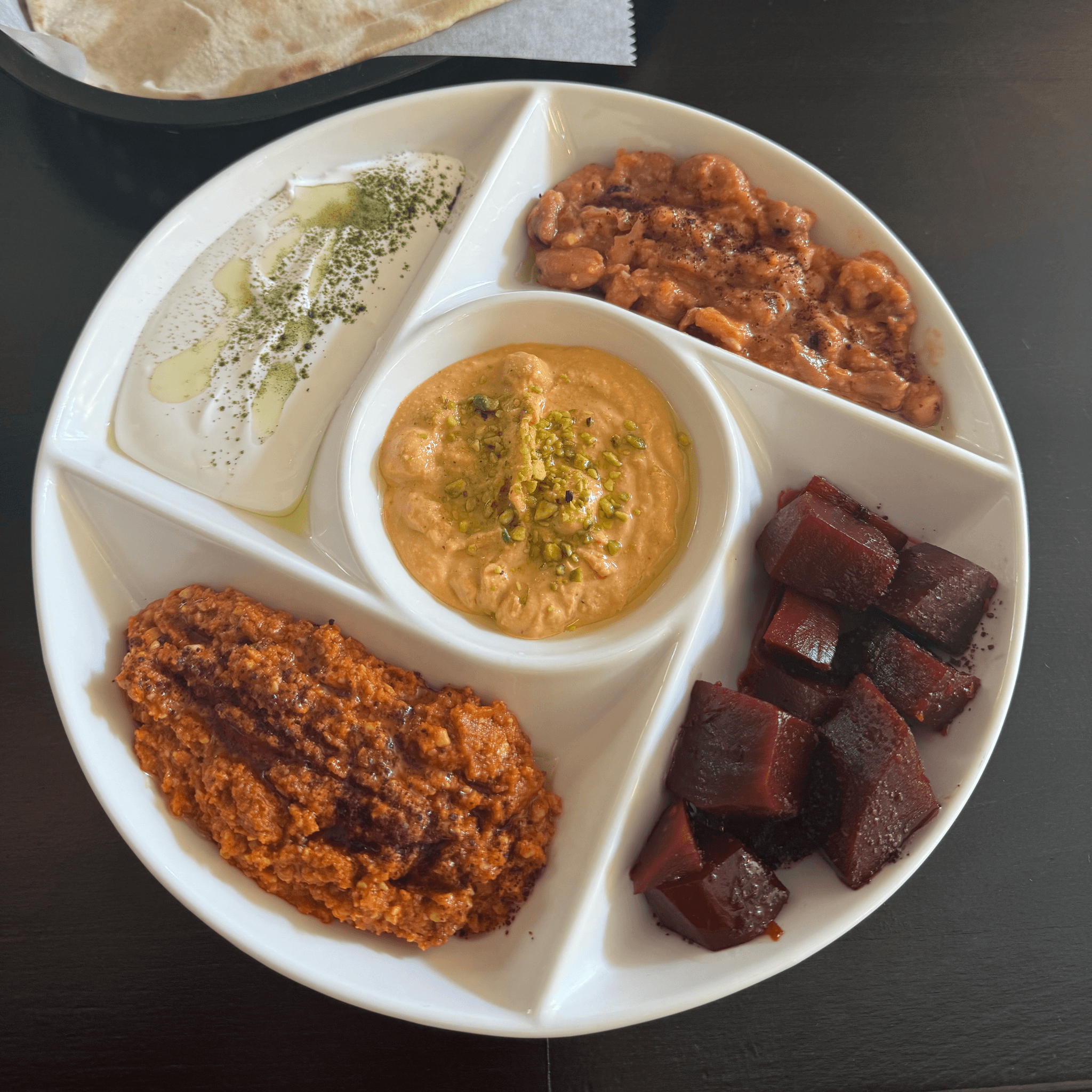 Roasted red peppers, cashews, olive oil, and spices. Served with fresh pita bread