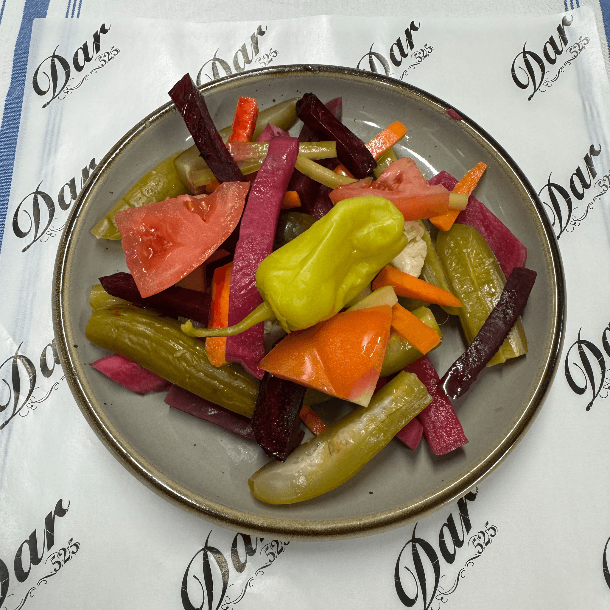 A medley of crisp vegetables, typically including cucumbers, carrots, and onions, marinated in a tangy vinegar brine