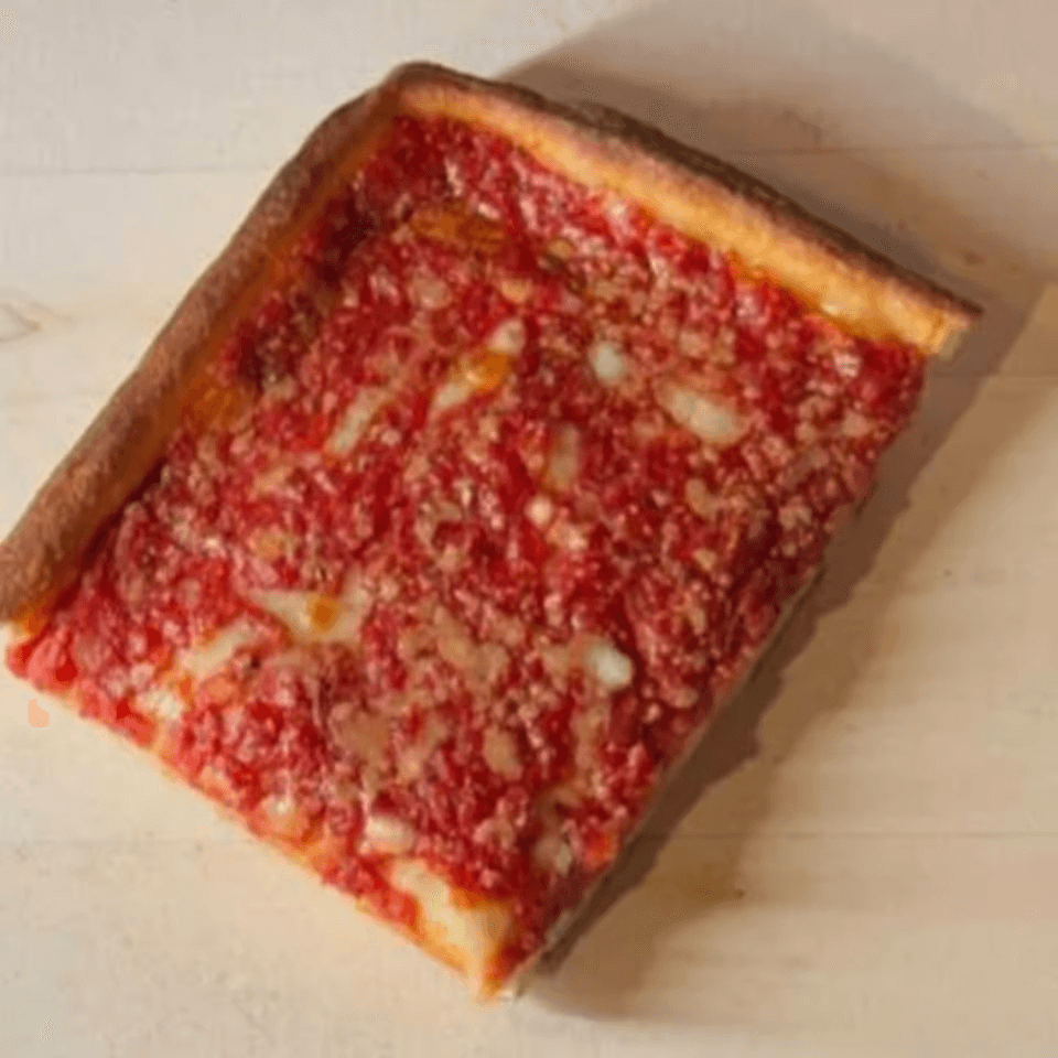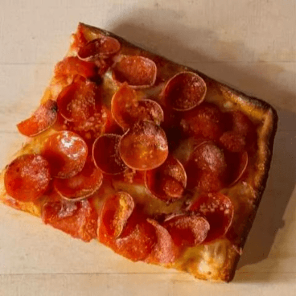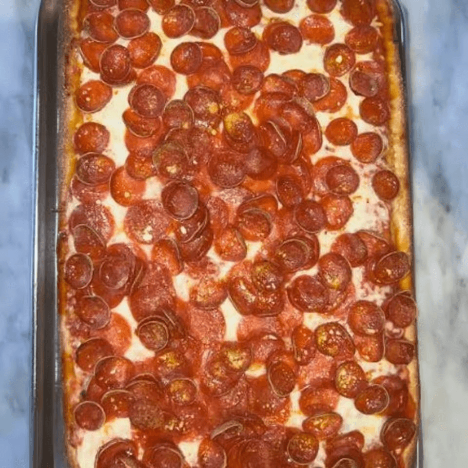 Thinly sliced pepperoni on a Sicilian-style crust.