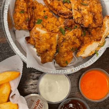 Crispy boneless buttermilk fried chicken tender served with a side of Mike's hot honey.
