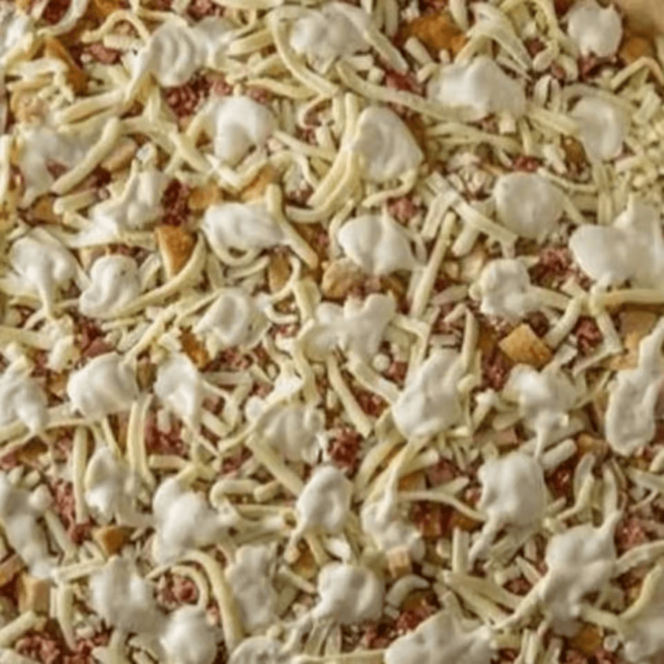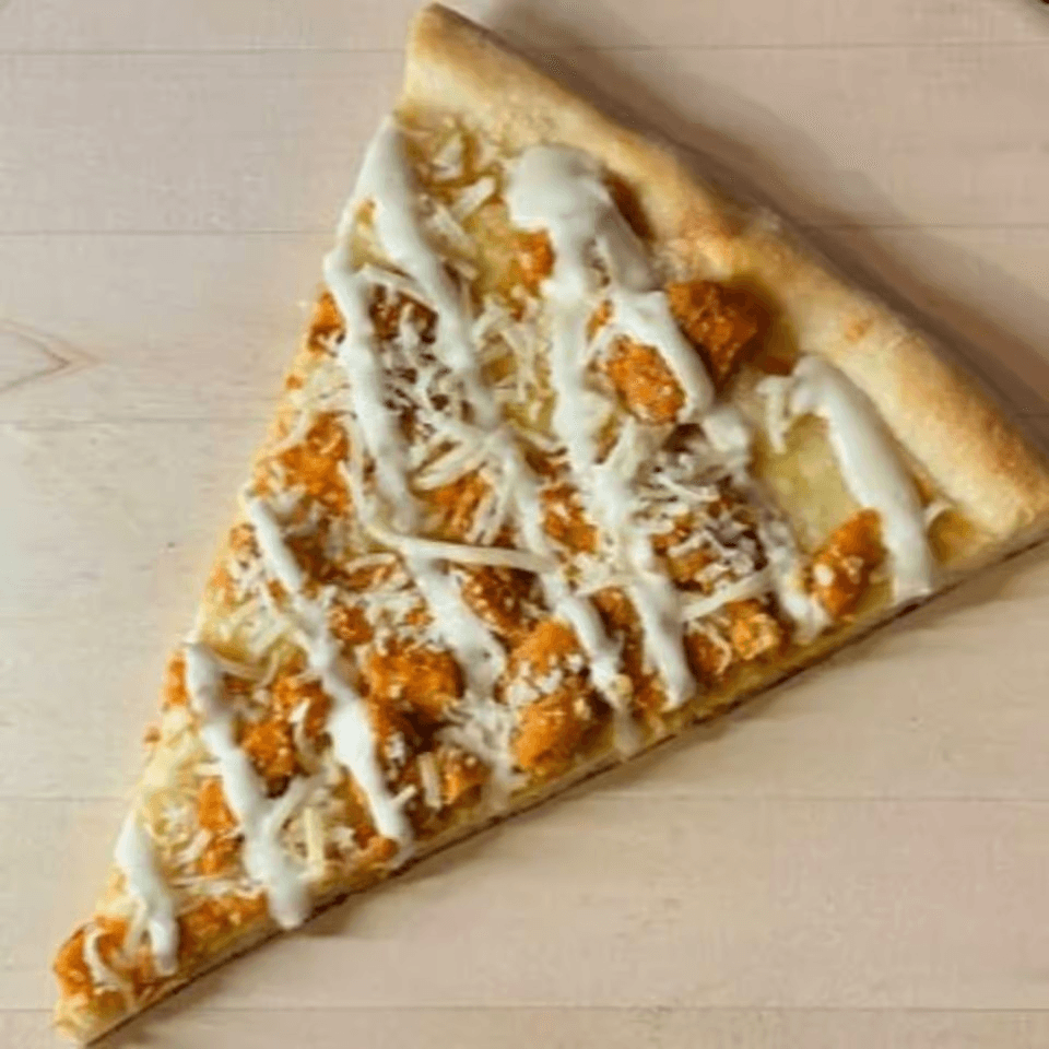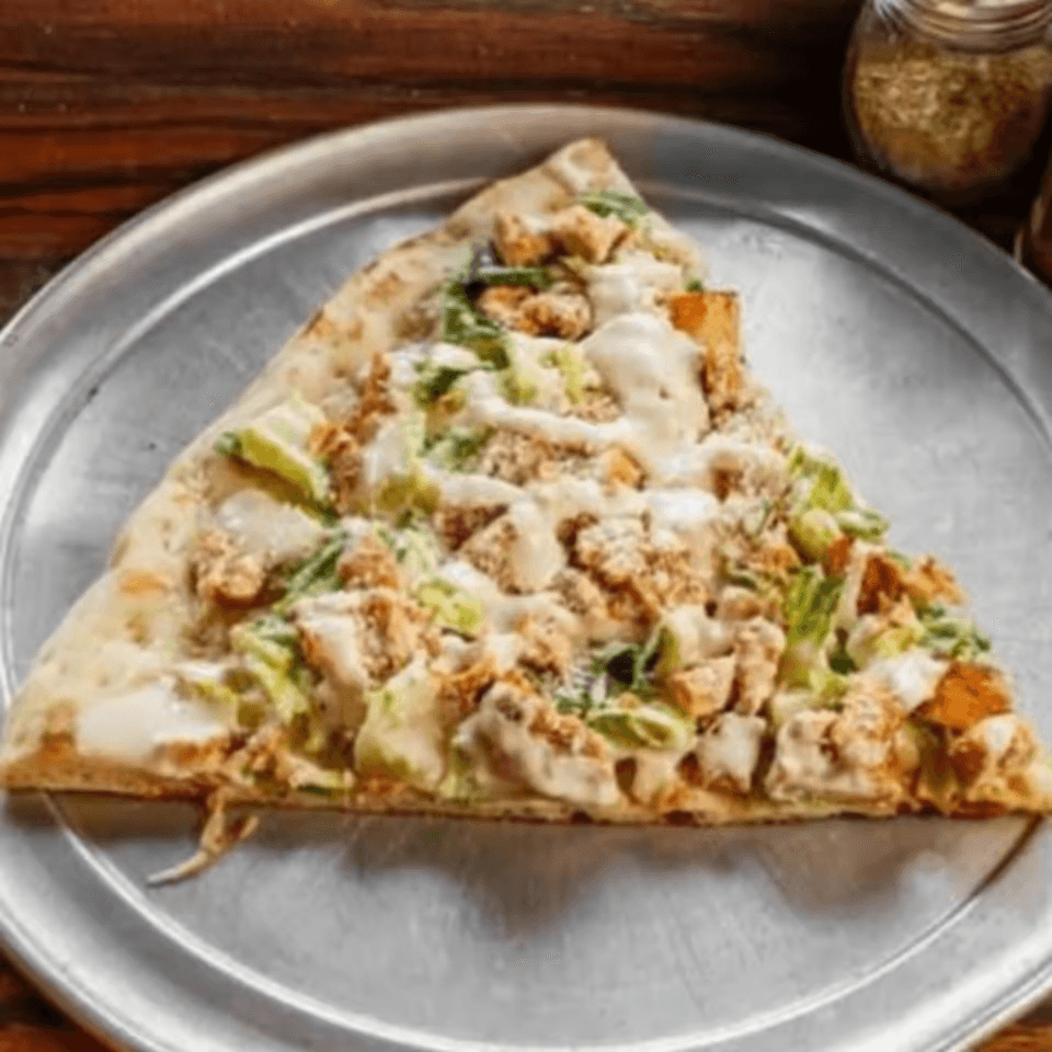 Tender chicken, crispy bacon, and creamy ranch on a slice of pizza.