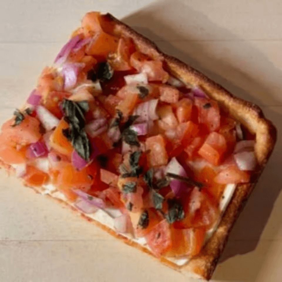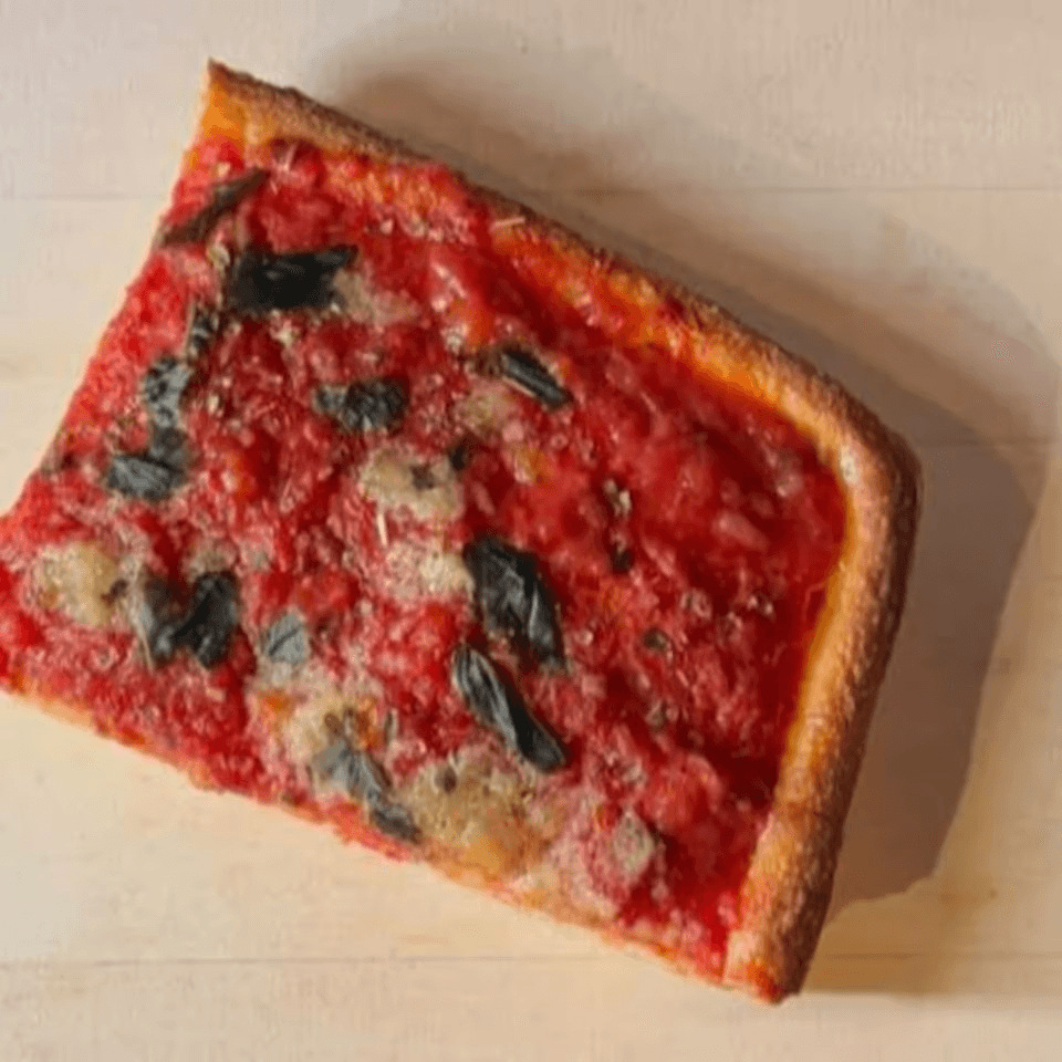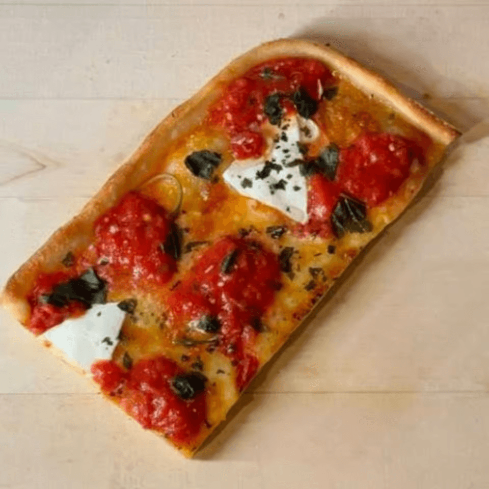Thin, square-cut slice topped with dollops of tomato sauce, fresh mozzarella, and basil for a classic grandma-style bite.