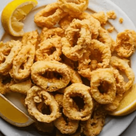 Crispy Calamari served with lemon and tomato sauce on the side.