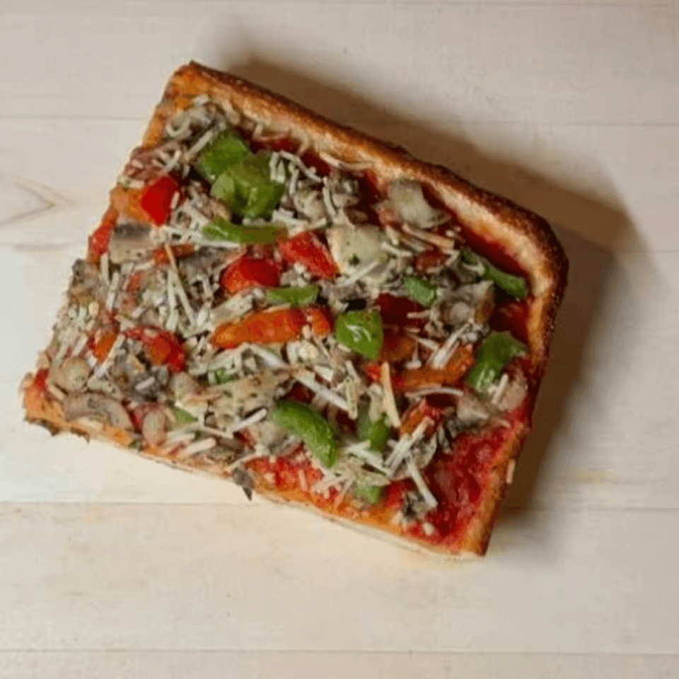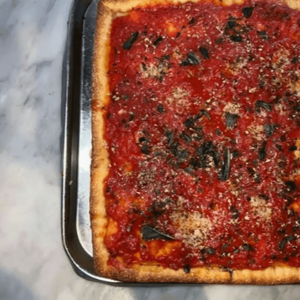 Vegan Sicilian-style pie with a tangy marinara sauce.