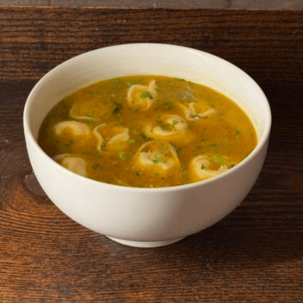 Delicate tortellini served in a savory broth, offering a comforting and classic Italian soup experience.