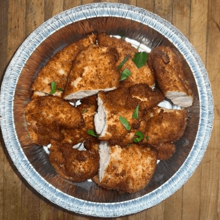 Boneless buttermilk fried chicken with hot honey, served with a side.
