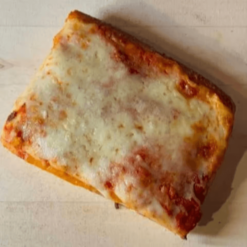 Sicilian slice with sauce on top of mozzarella, sprinkled with grated cheese.