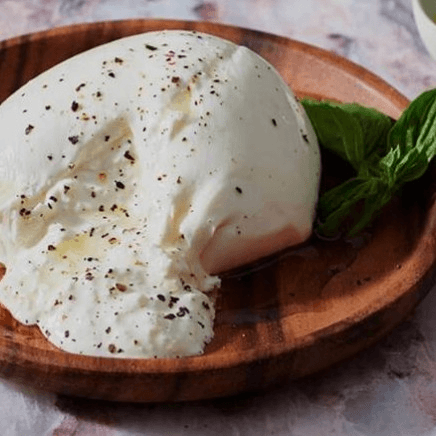 Fresh mozzarella filled with cream and shredded stracciatella cheese.