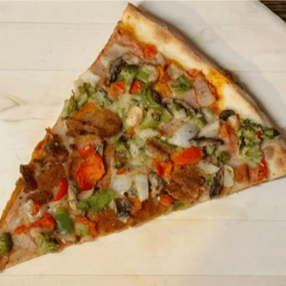 Vegan pizza slice loaded with a variety of vegetables.