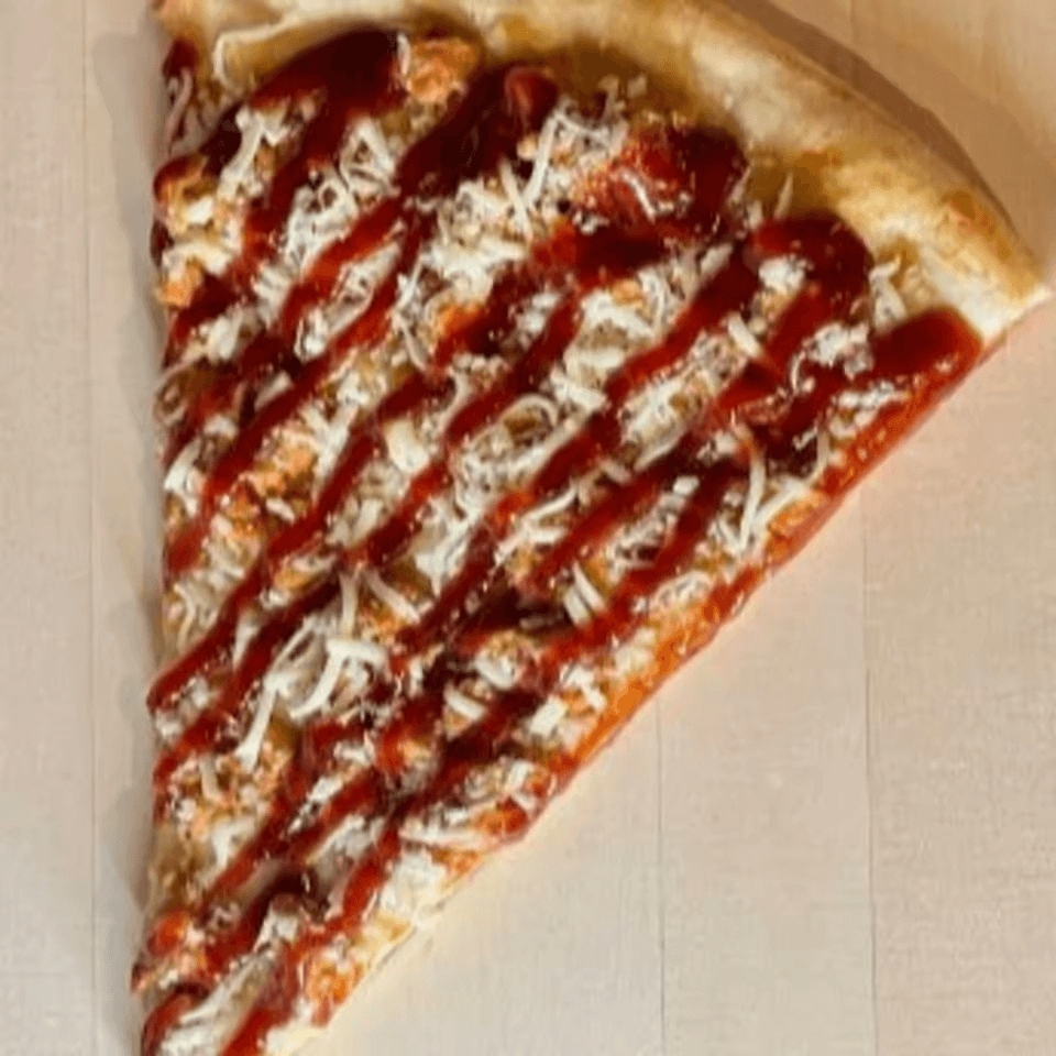Tender chicken and BBQ sauce on a slice of pizza.