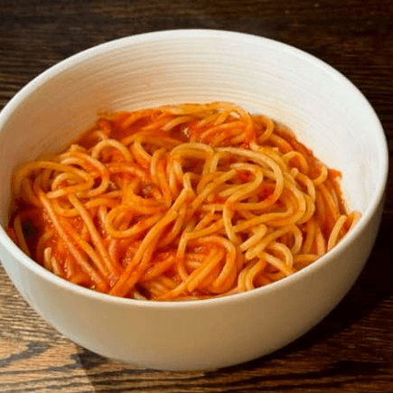 Tender spaghetti tossed in a rich tomato sauce.