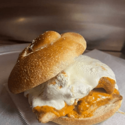 Breaded chicken cutlet with tomato sauce and melted mozzarella on panini bread.