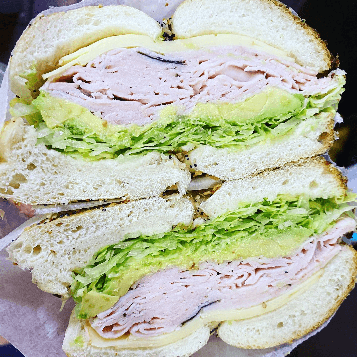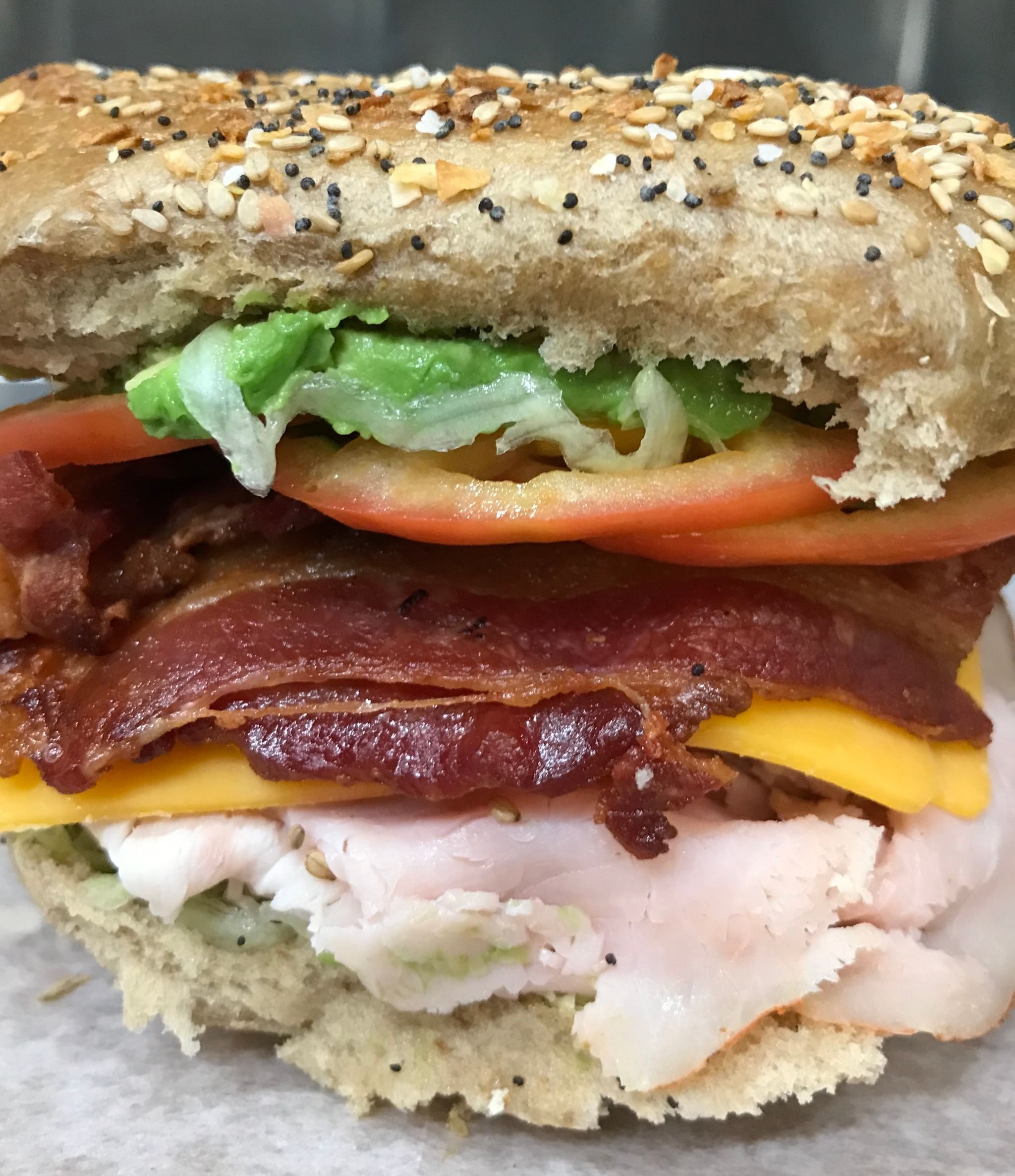Boars head oven gold turkey, cheddar cheese, bacon, lettuce, tomato and avocado on whole wheat everything bagel