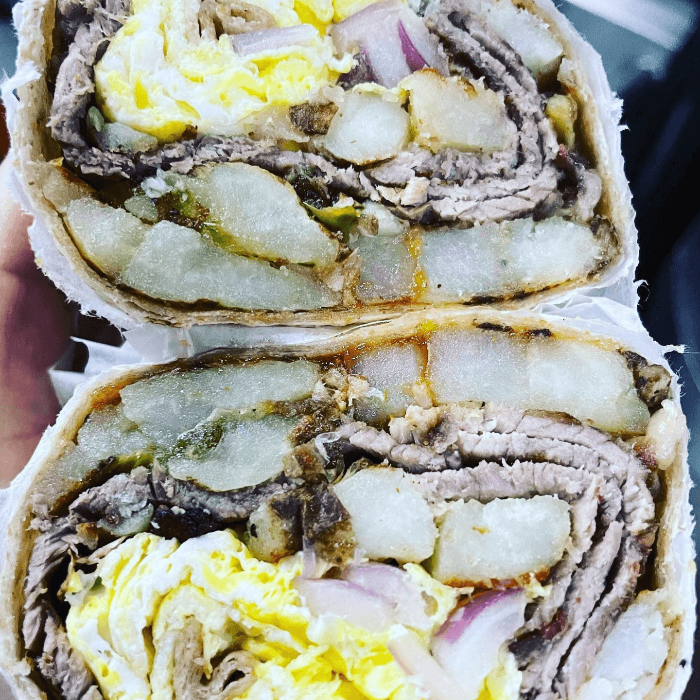 Eggs, grilled steak, roasted potatoes and grilled onions in a wheat wrap