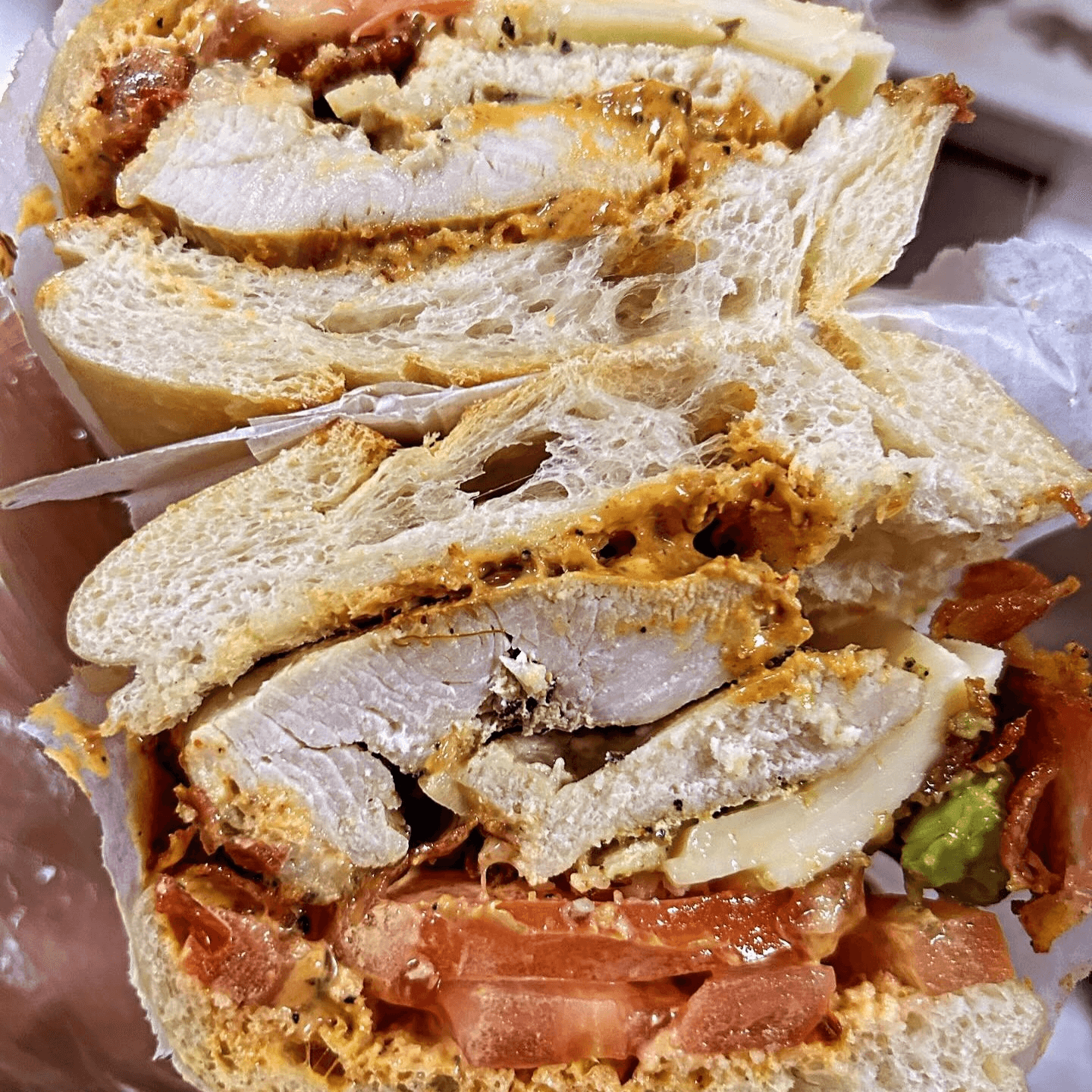 Breaded chicken cutlet, smoked Gouda cheese, avocado, chipotle mayo on garlic roll