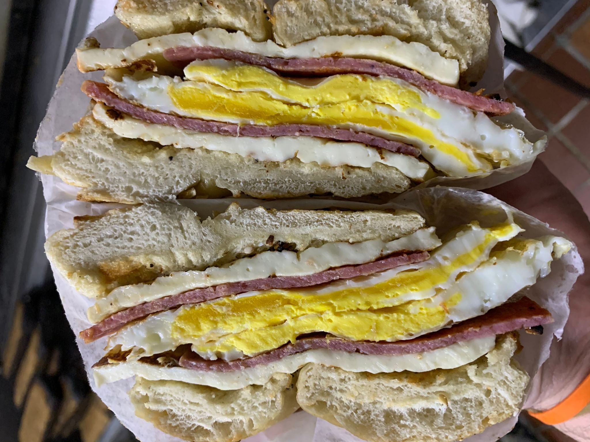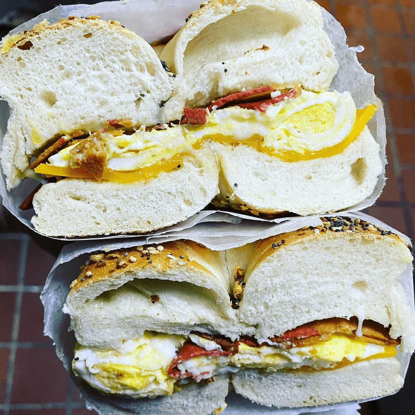 Fried eggs, grilled salami, fried tropical cheese on an everything bagel