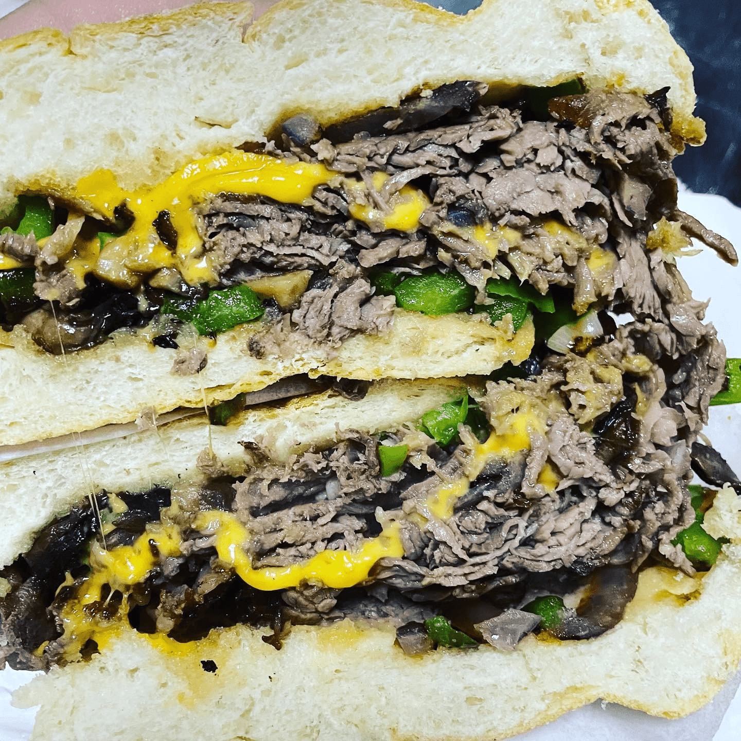 Sirloin,melted cheddar,peppers and onions Pressed to perfection