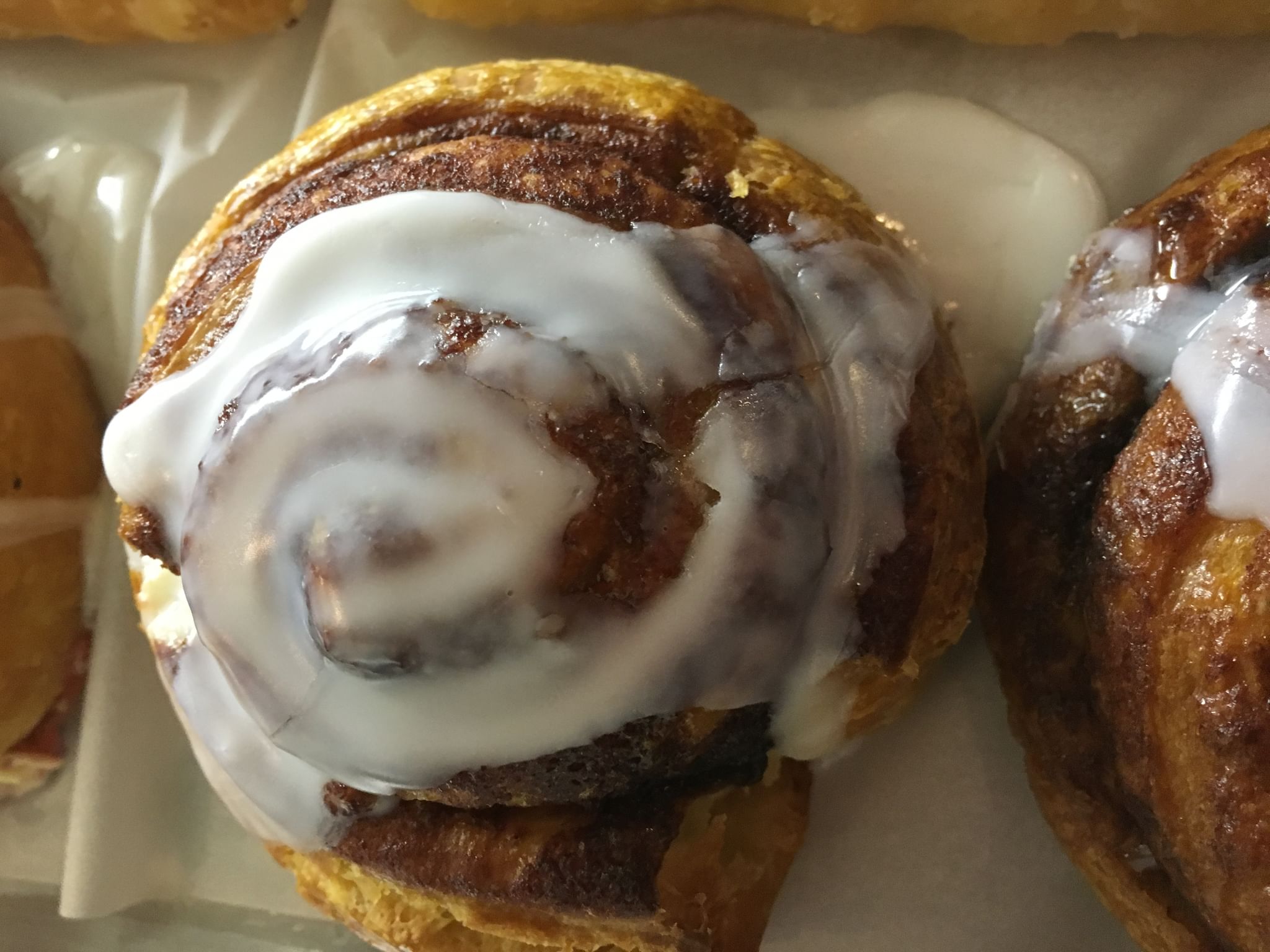 Cinnamon bun with crisp bacon, egg and melted American cheese