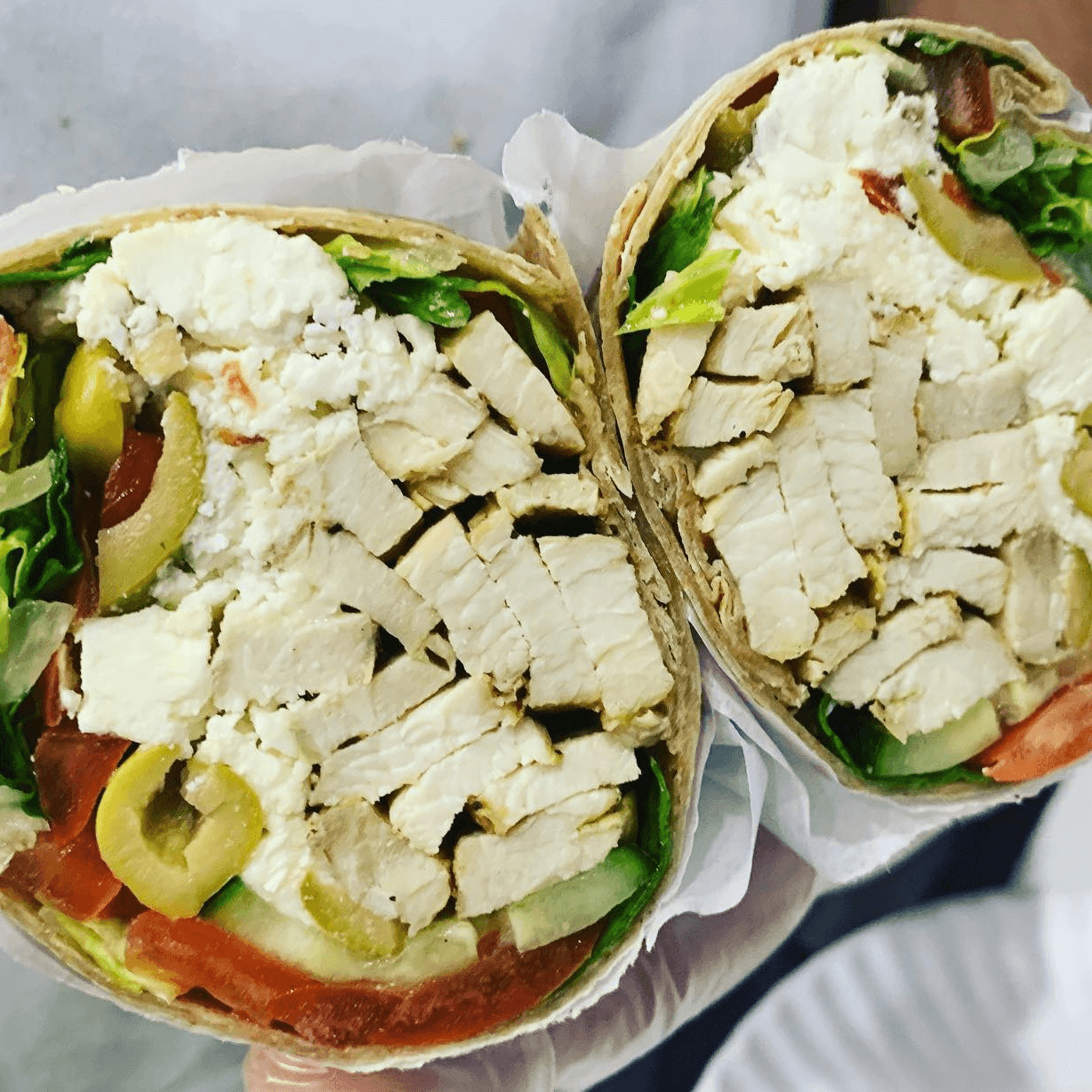 The Greek grilled chicken, spinach, tomatoes, pepperoncini, feta cheese, olive oil, and balsamic vinegar in a spinach wrap