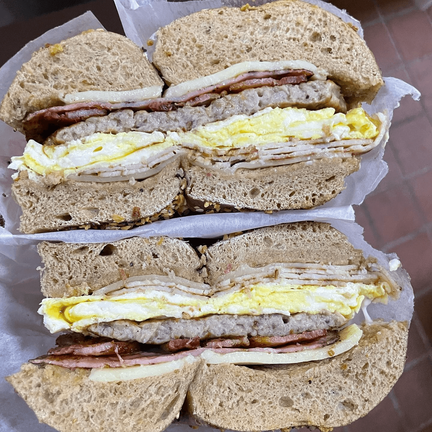 3 eggs, bacon, sausage, ham, turkey, melted Swiss and American cheese on an everything bagel