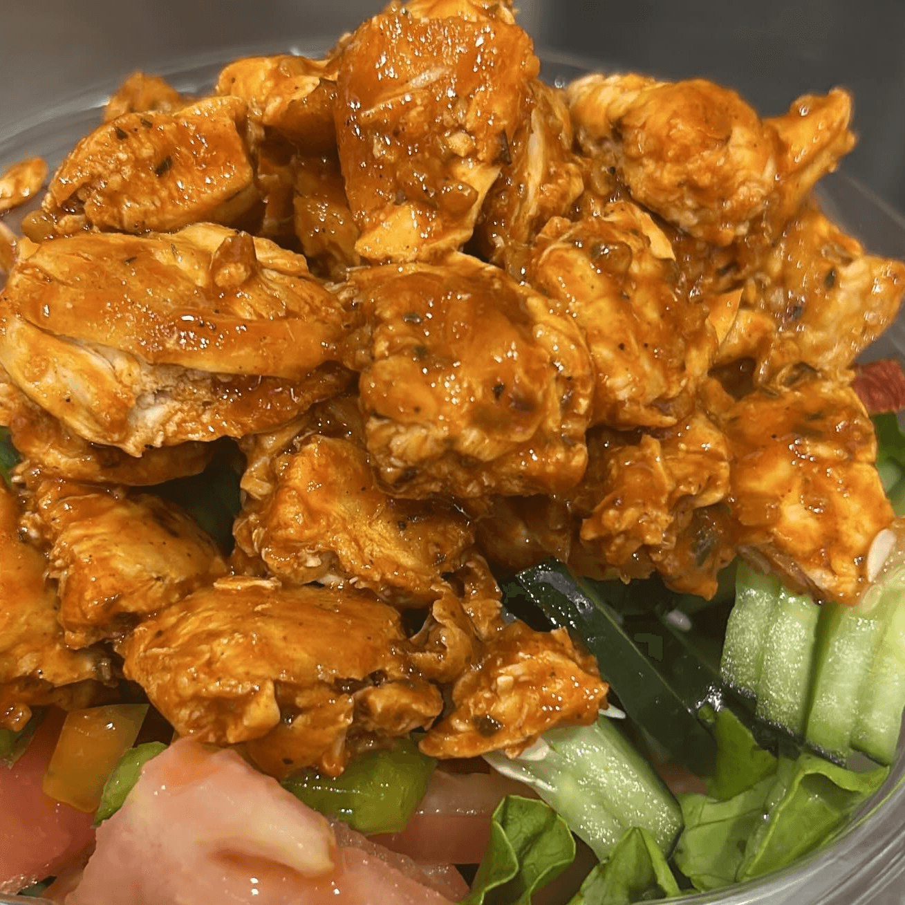 Diced buffalo chicken cutlet over fresh greens with diced tomatoes, green peppers, red onion, cucumbers and sun dried tomatoes