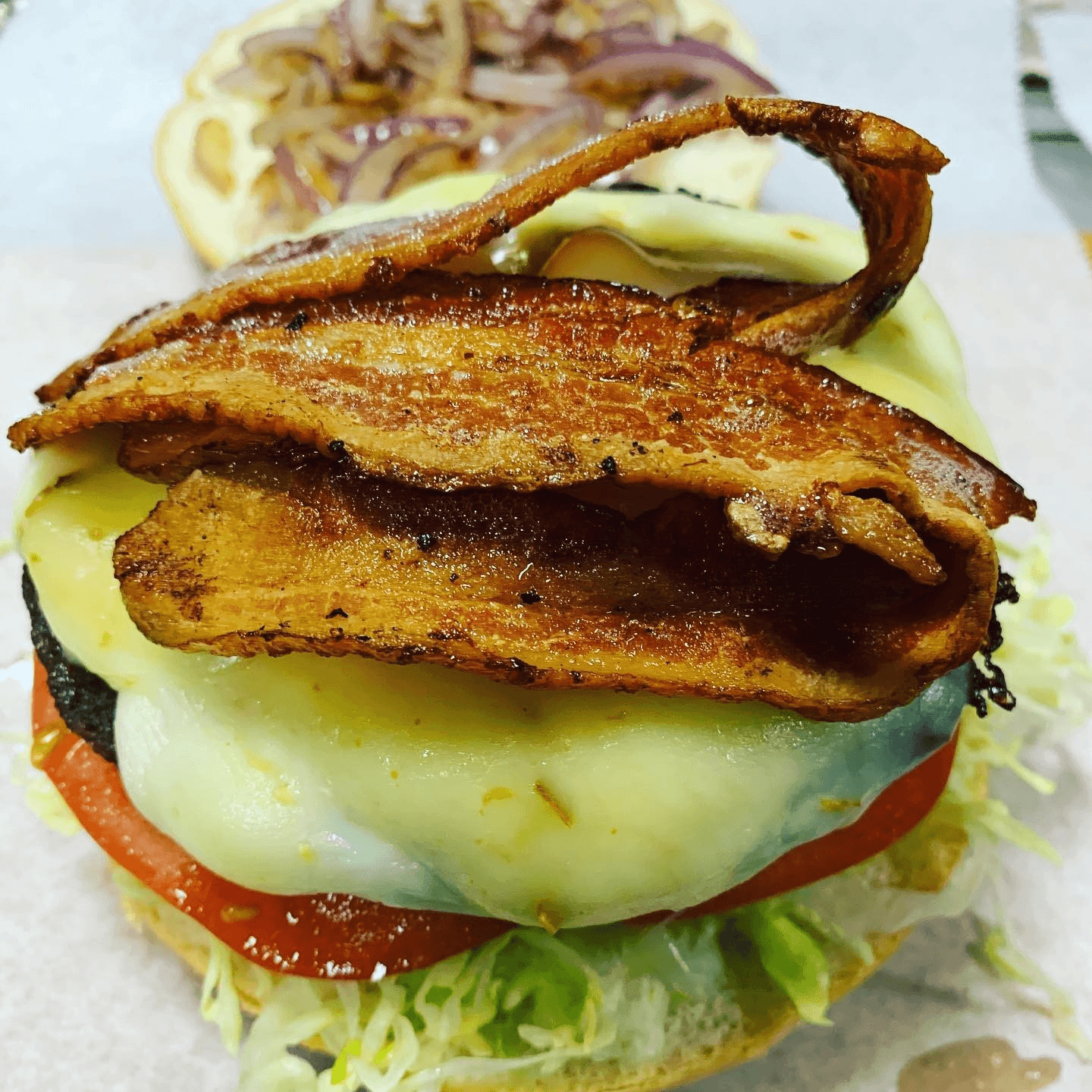 Plant protein bacon, eggs, and vegan chao cheese on an everything bagel