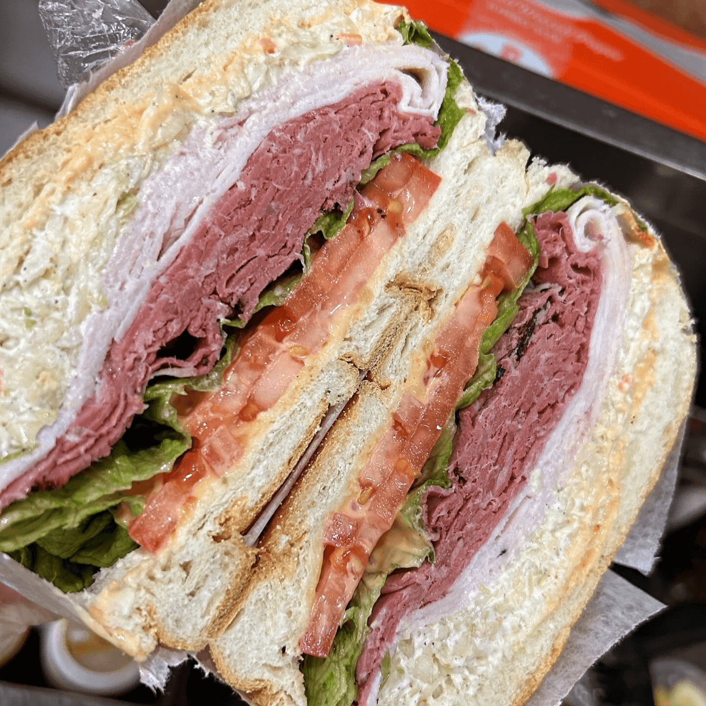 Roasted turkey, corned beef, Muenster cheese, Russian dressing and coleslaw