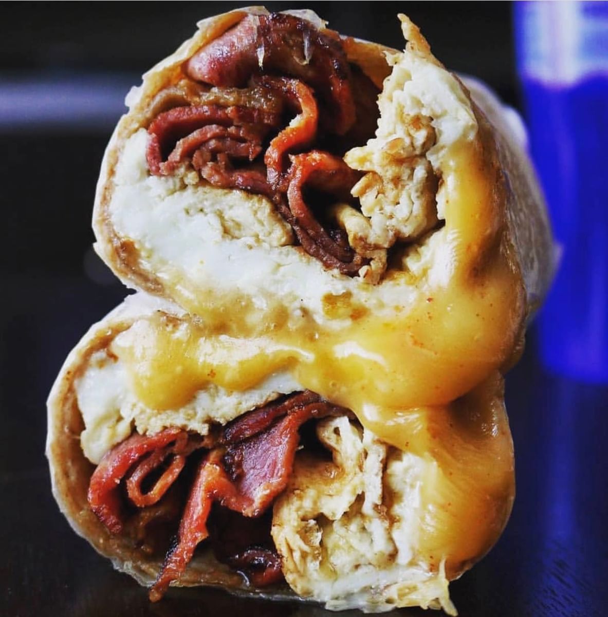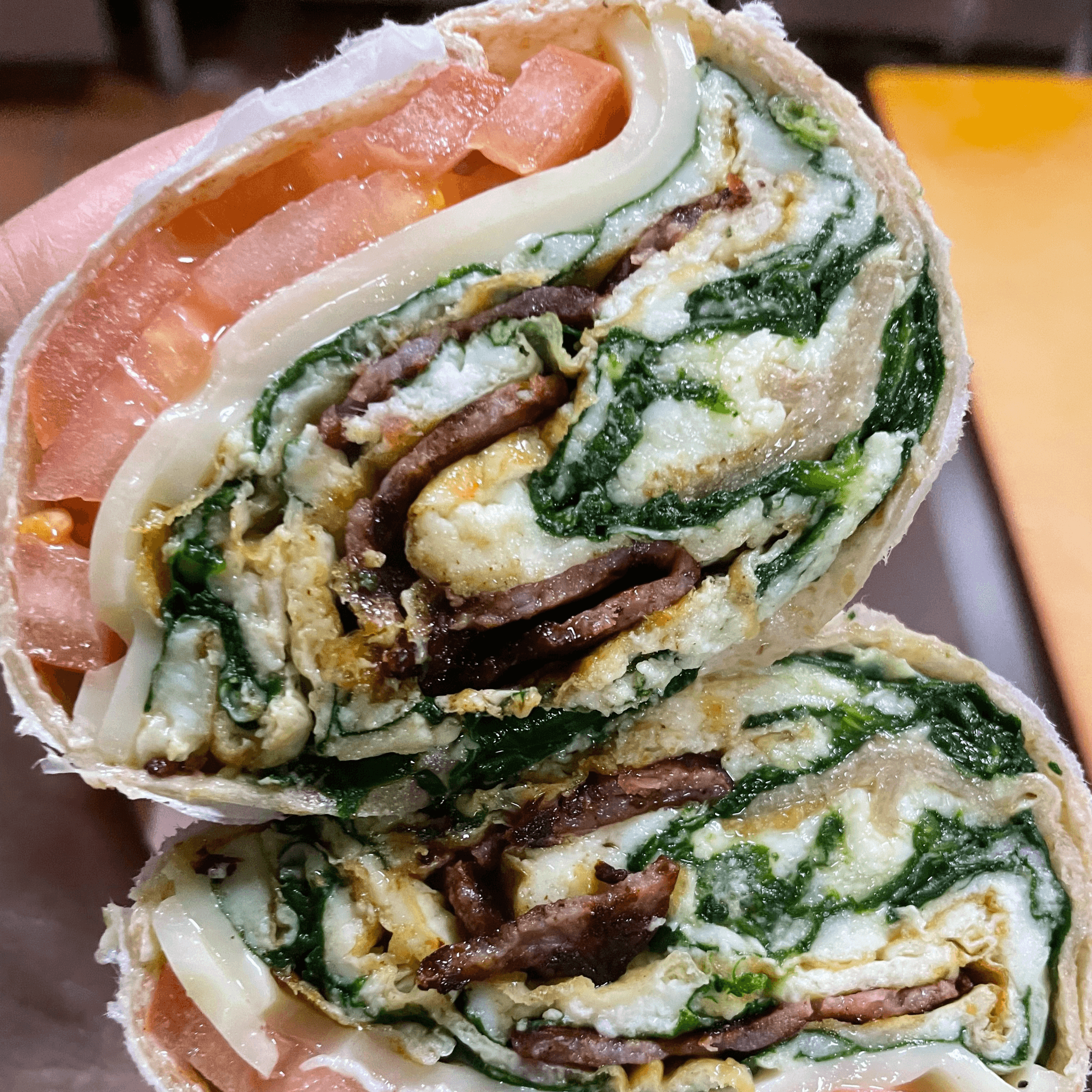 Eggs Taylor ham, cheddar cheese, home fries and grilled onions in a spinach wrap
