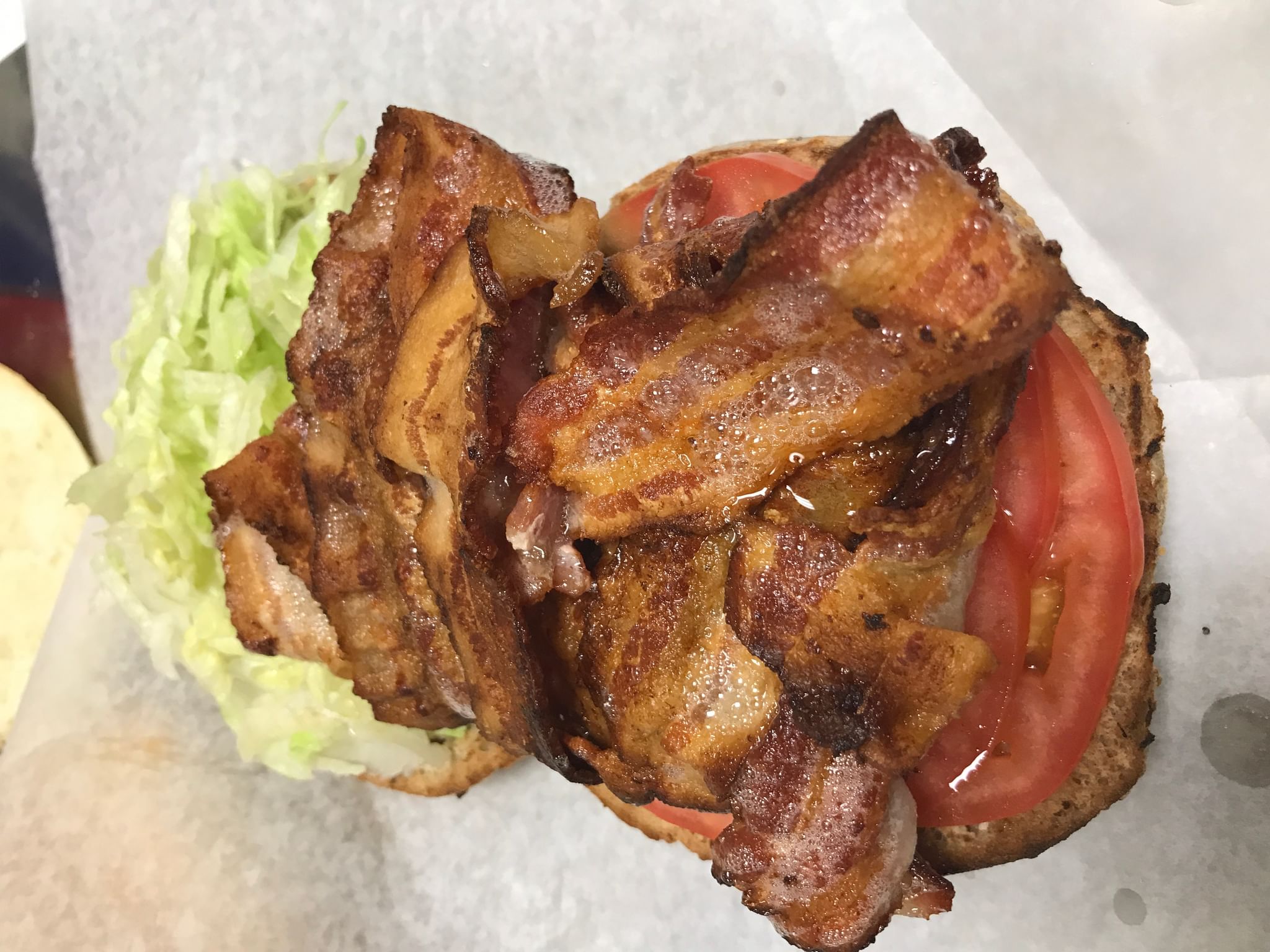Double order of bacon, lettuce, tomato and melted cheddar on an everything bagel