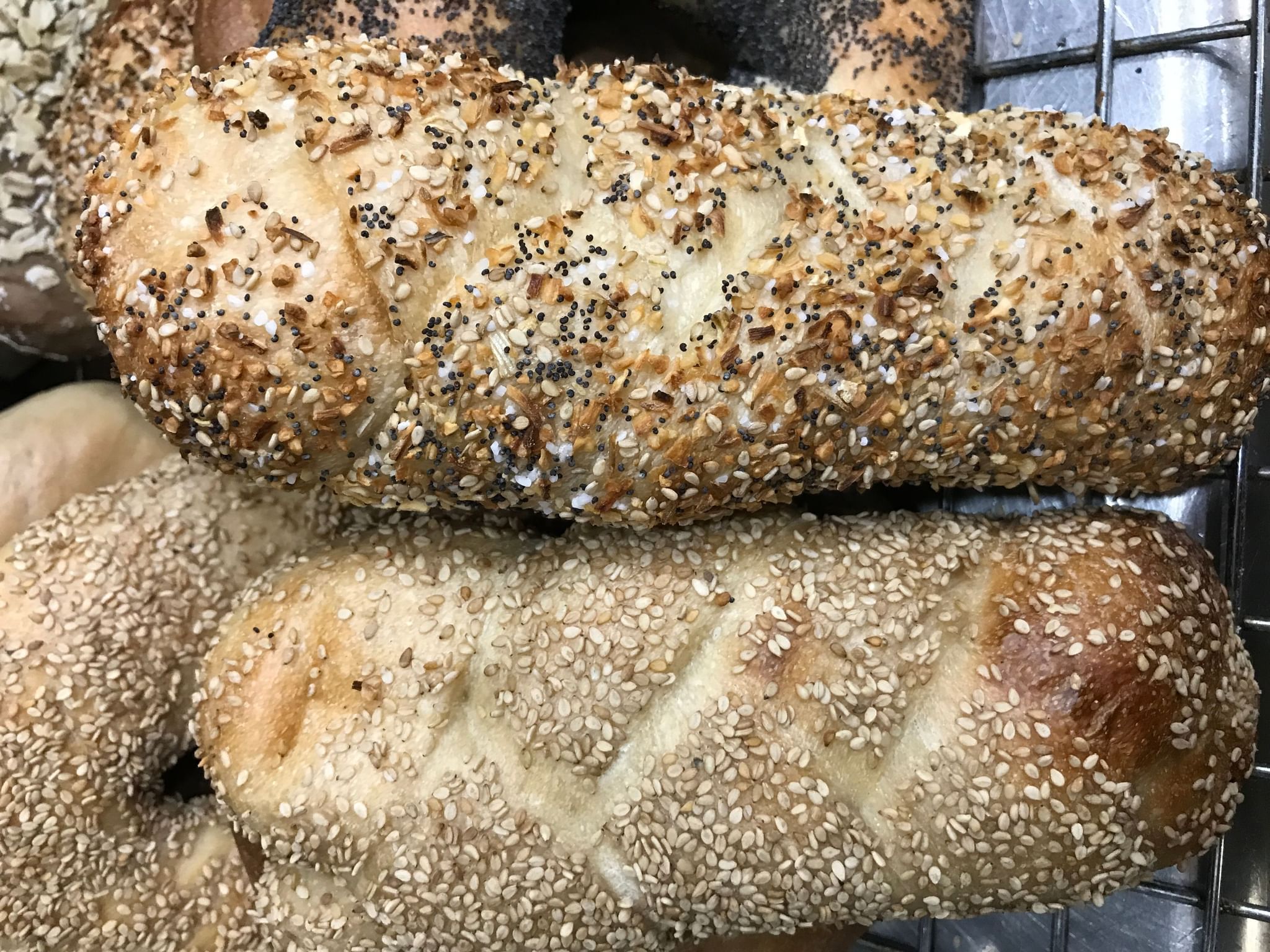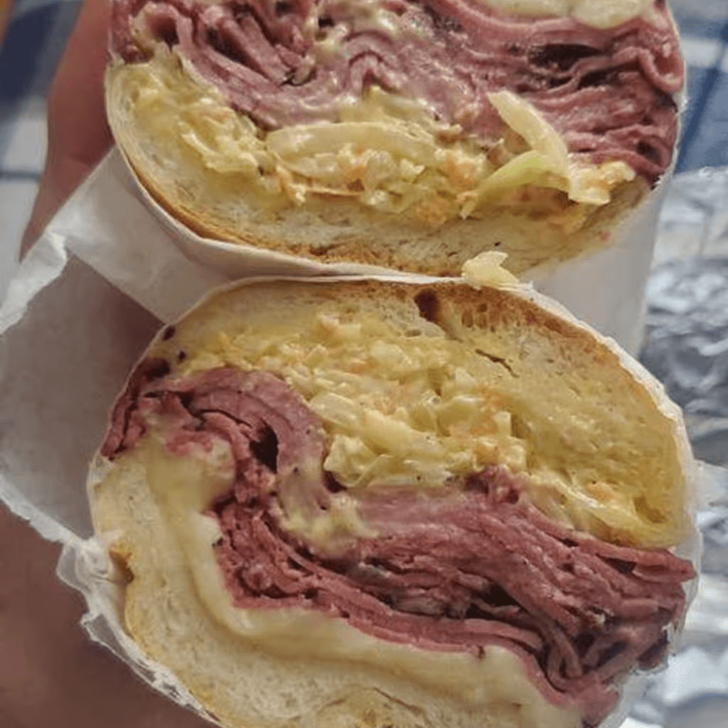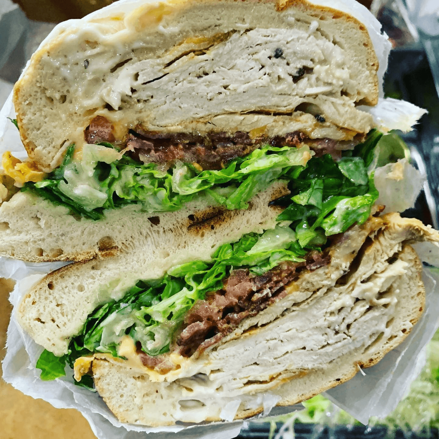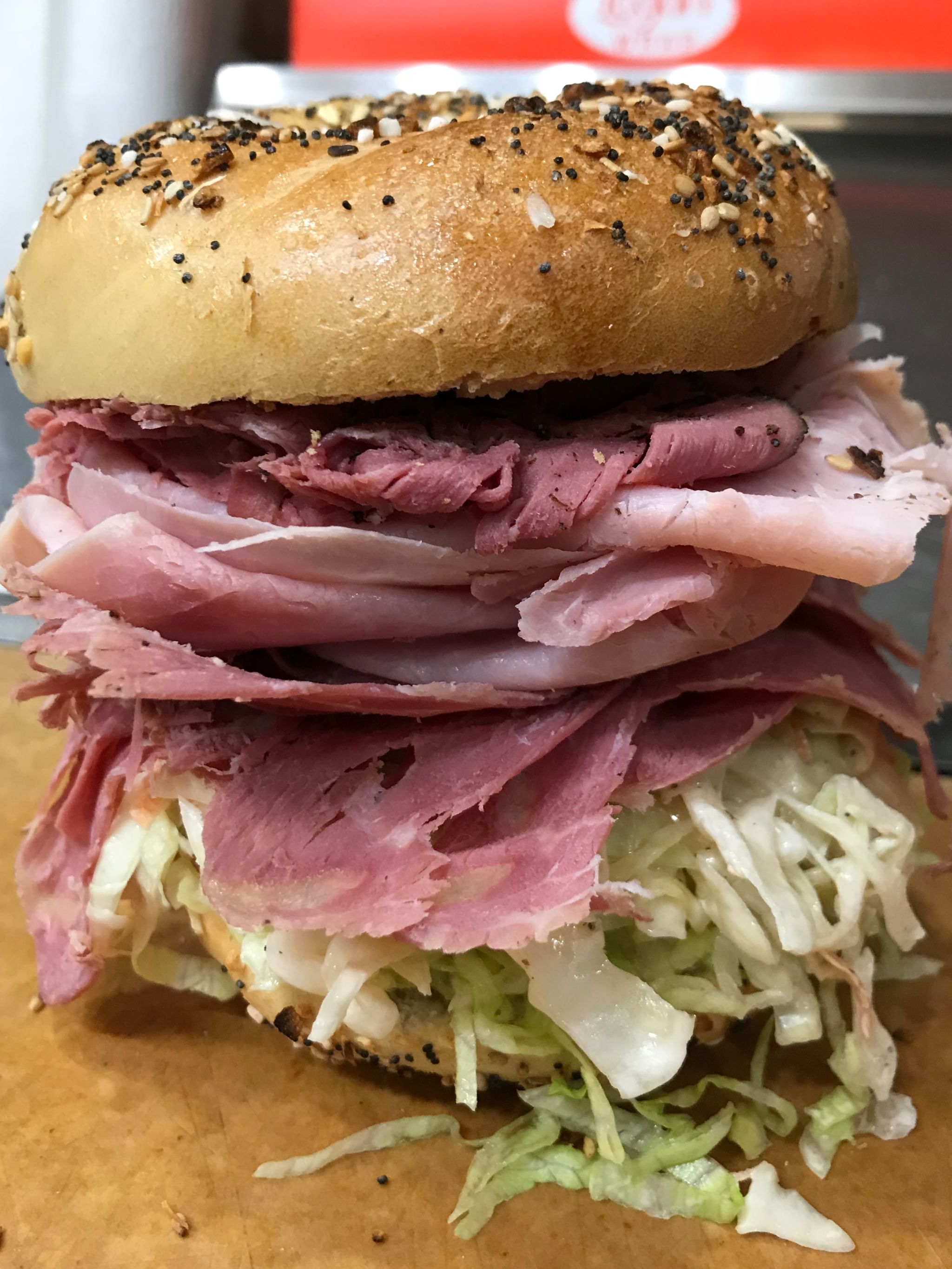 Corned beef, pastrami, turkey, coleslaw, lettuce, tomato and Russian dressing on an everything bagel