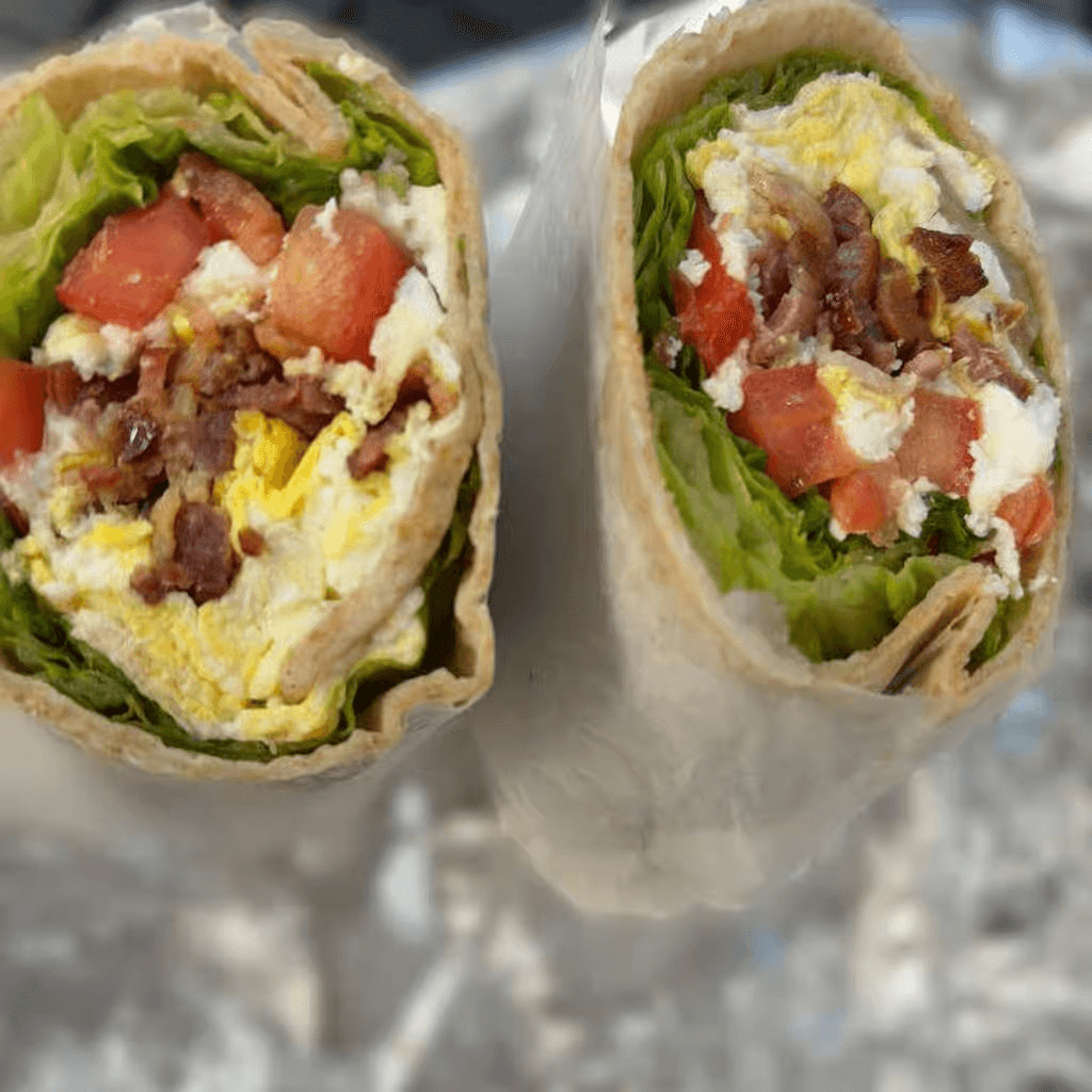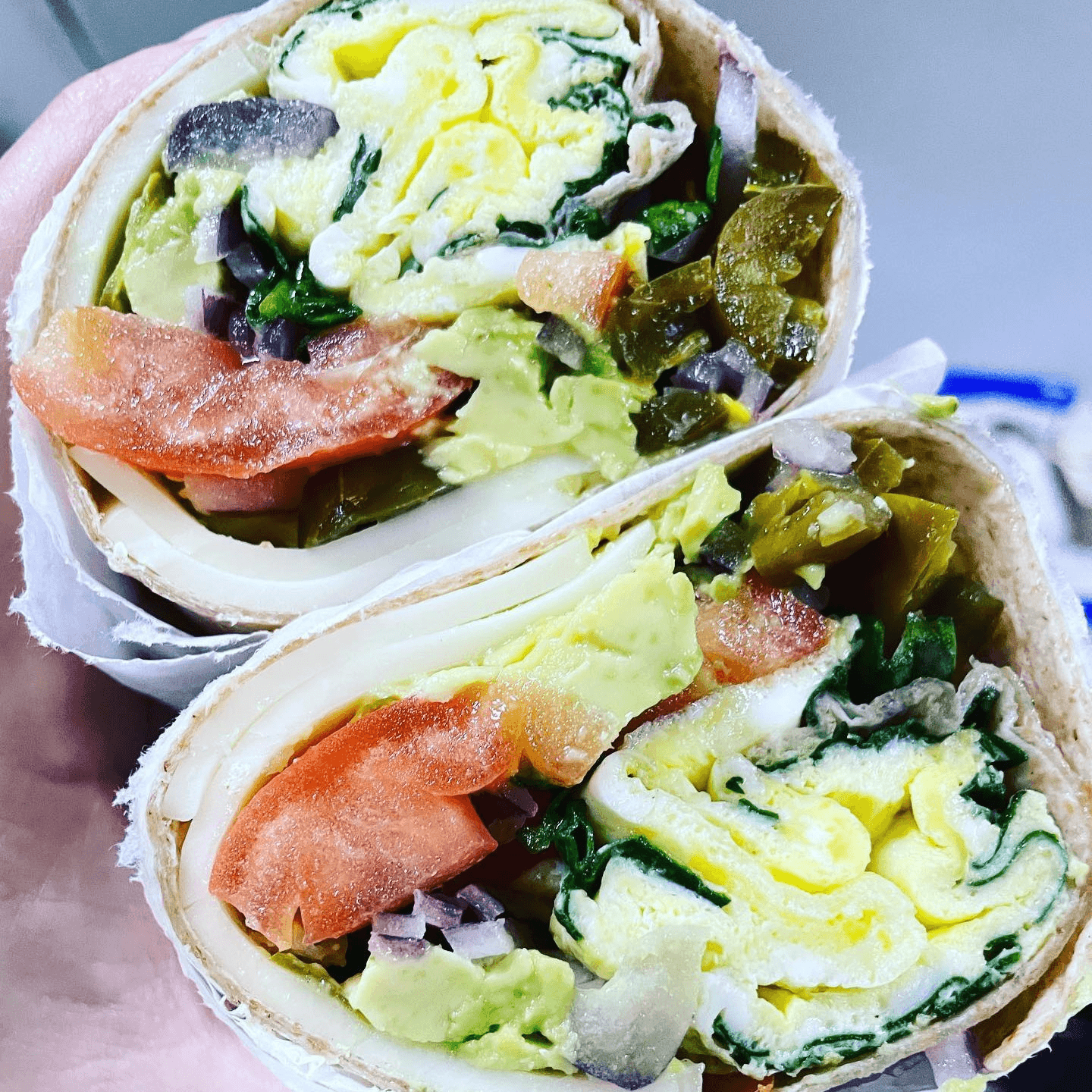 Eggs, sautéed green peppers, mushrooms, spinach, tomatoes, red onion, and sundried tomatoes with avocado in a wrap