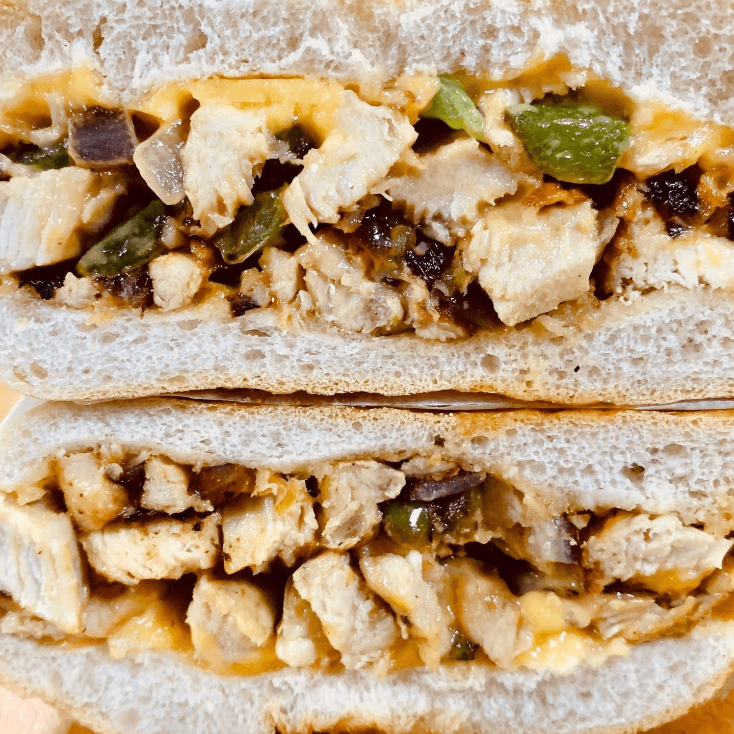 Chopped grilled chicken cutlet melted American, grilled peppers and caramelized onions