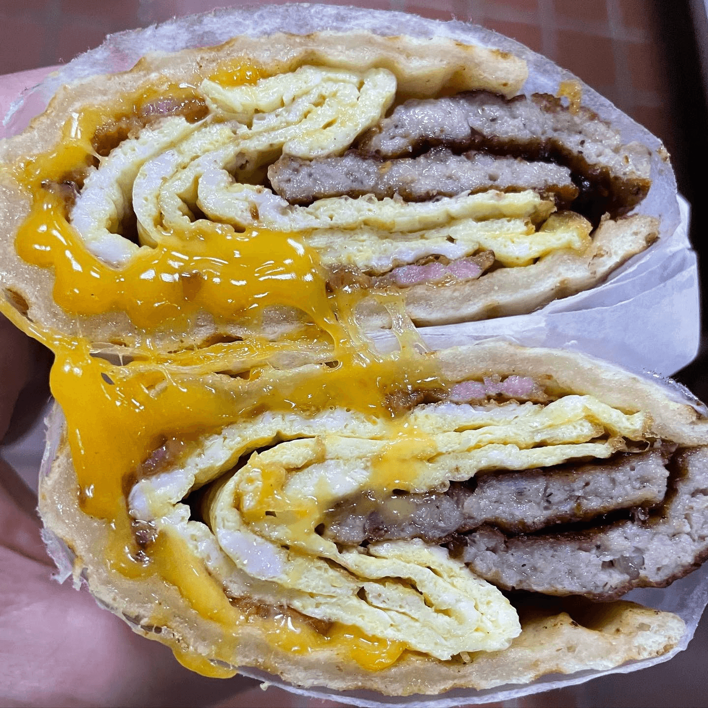 Eggs, bacon, sausage and Cheddar cheese pressed to perfection in a panini