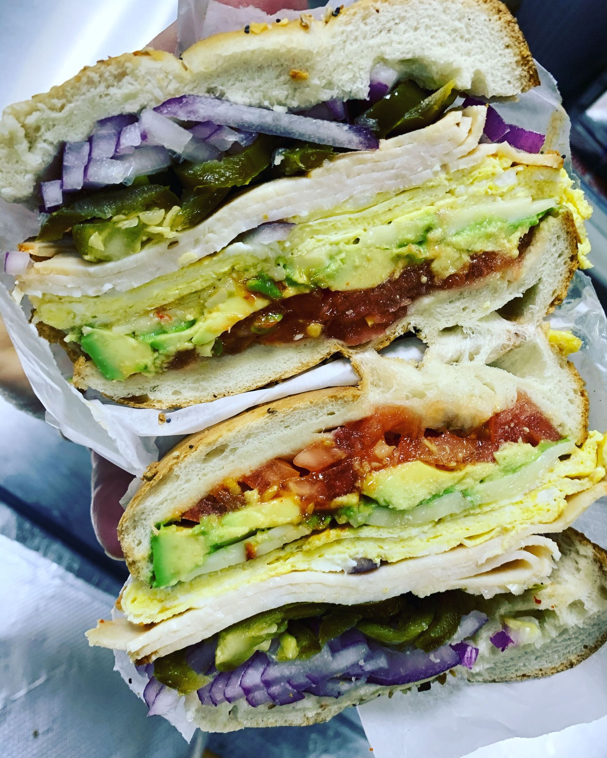 Eggs, turkey ,bacon, Cheddar, avocado, lettuce,tomatoes on an everything bagel