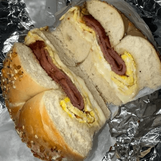Taylor ham (pork roll) egg cheese on an everything bagel
