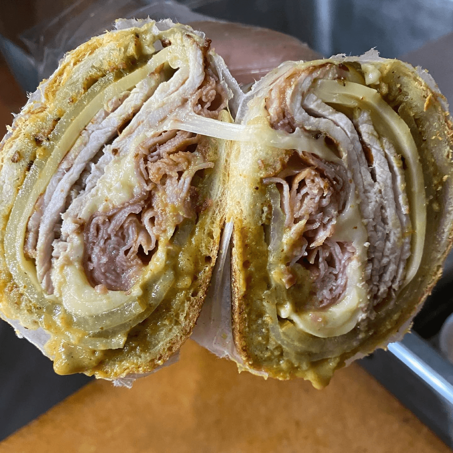Sausalito turkey, pepper turkey, melted jalapeno cheese, hot sauce and spicy mustard