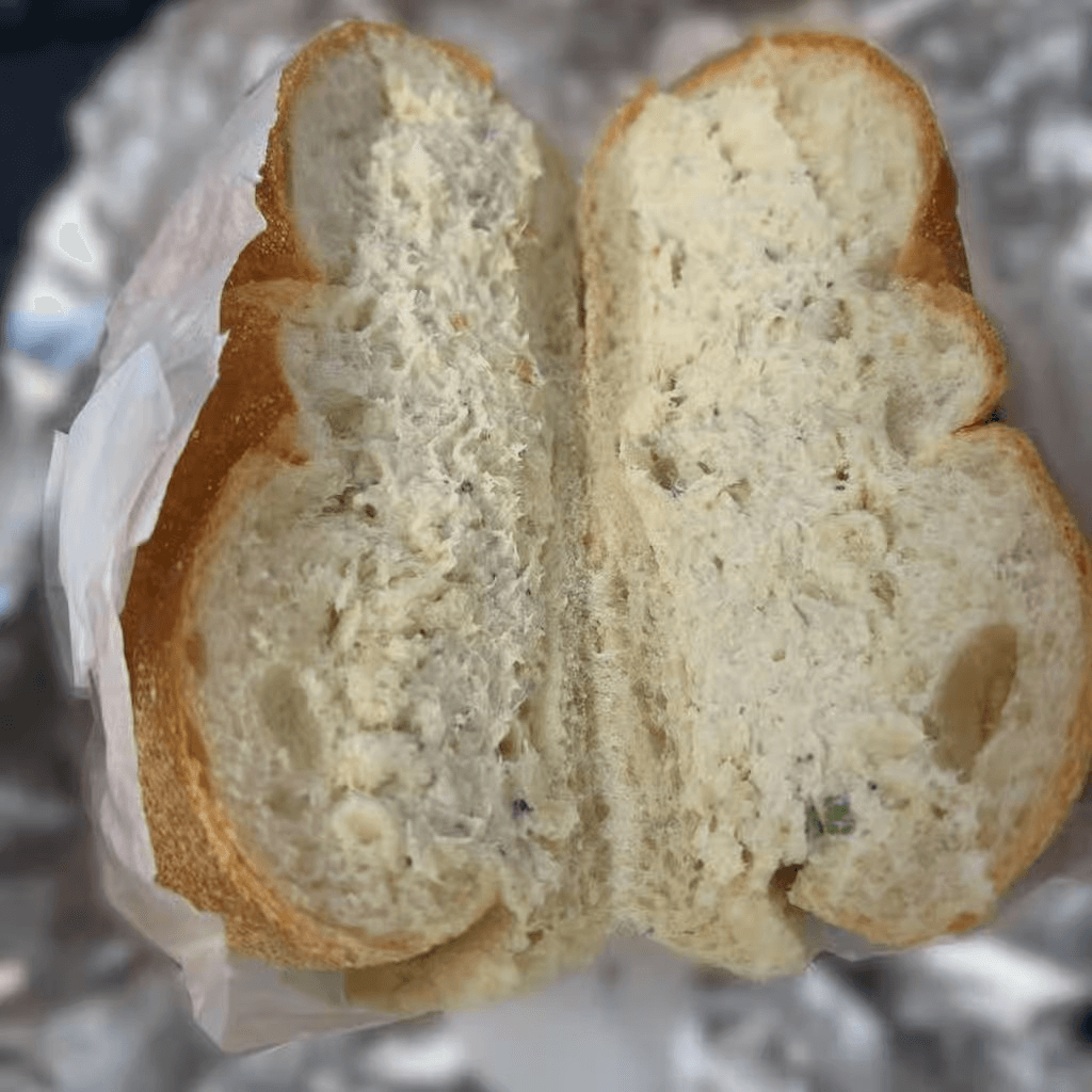 Goat cheese cream cheese Bacon tomato on an Everything Bagel