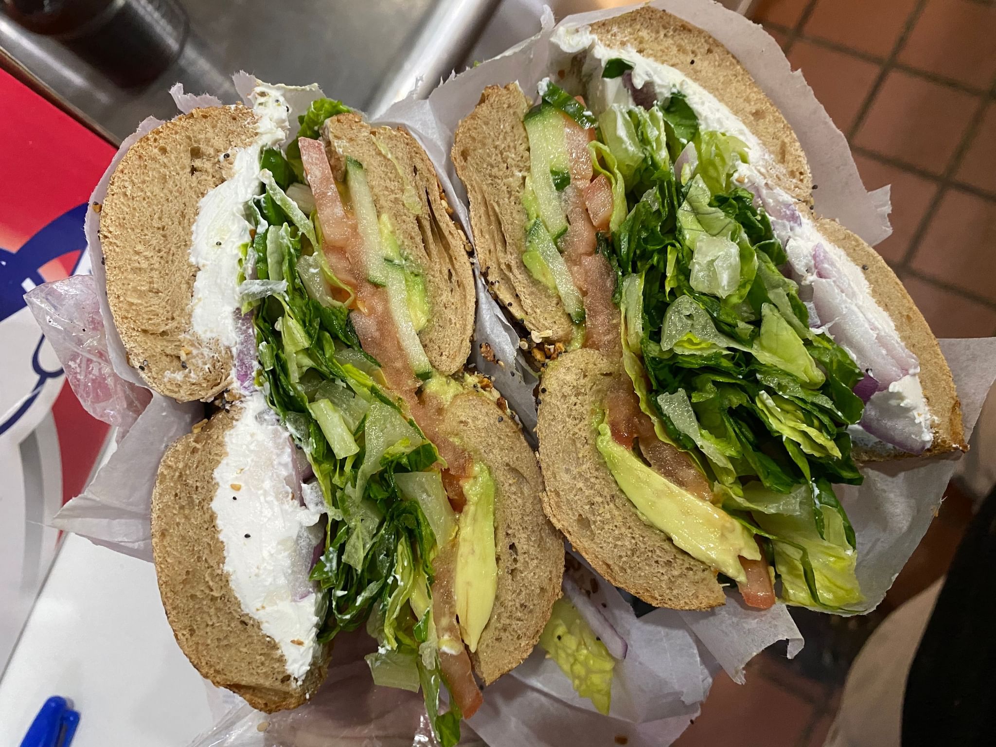 Tofu cream cheese, avocado, fresh greens, tomato, cucumbers, red onion, on a whole wheat everything bagel