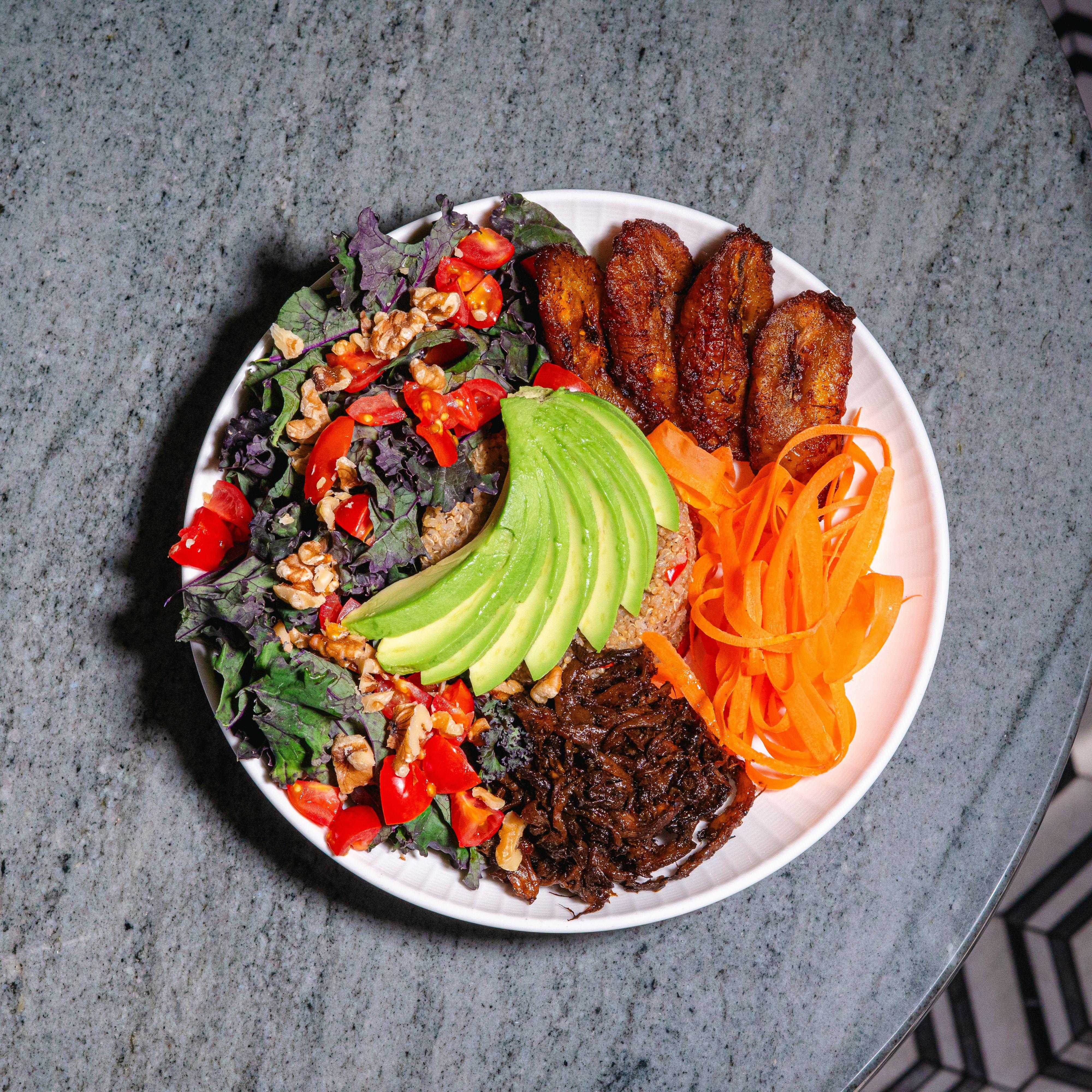 Quinoa, red organic kale, tomatoes, avocado, carrots, maduros, walnuts and Jerk oyster mushrooms
