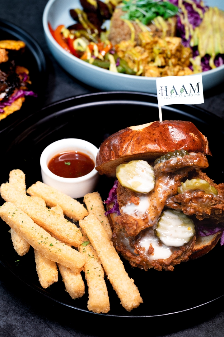 Jerk-tamarind glaze, garlic aioli over crispy oyster mushrooms, purple cabbage & pickles on a sesame-poppy pretzel bun w/ Yucca Fries