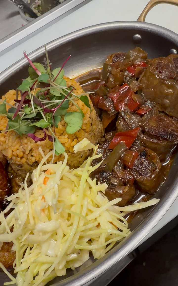 Tender oxtail simmered in Caribbean spices, served with rice and peas, caramelized maduros, & crisp cabbage slaw