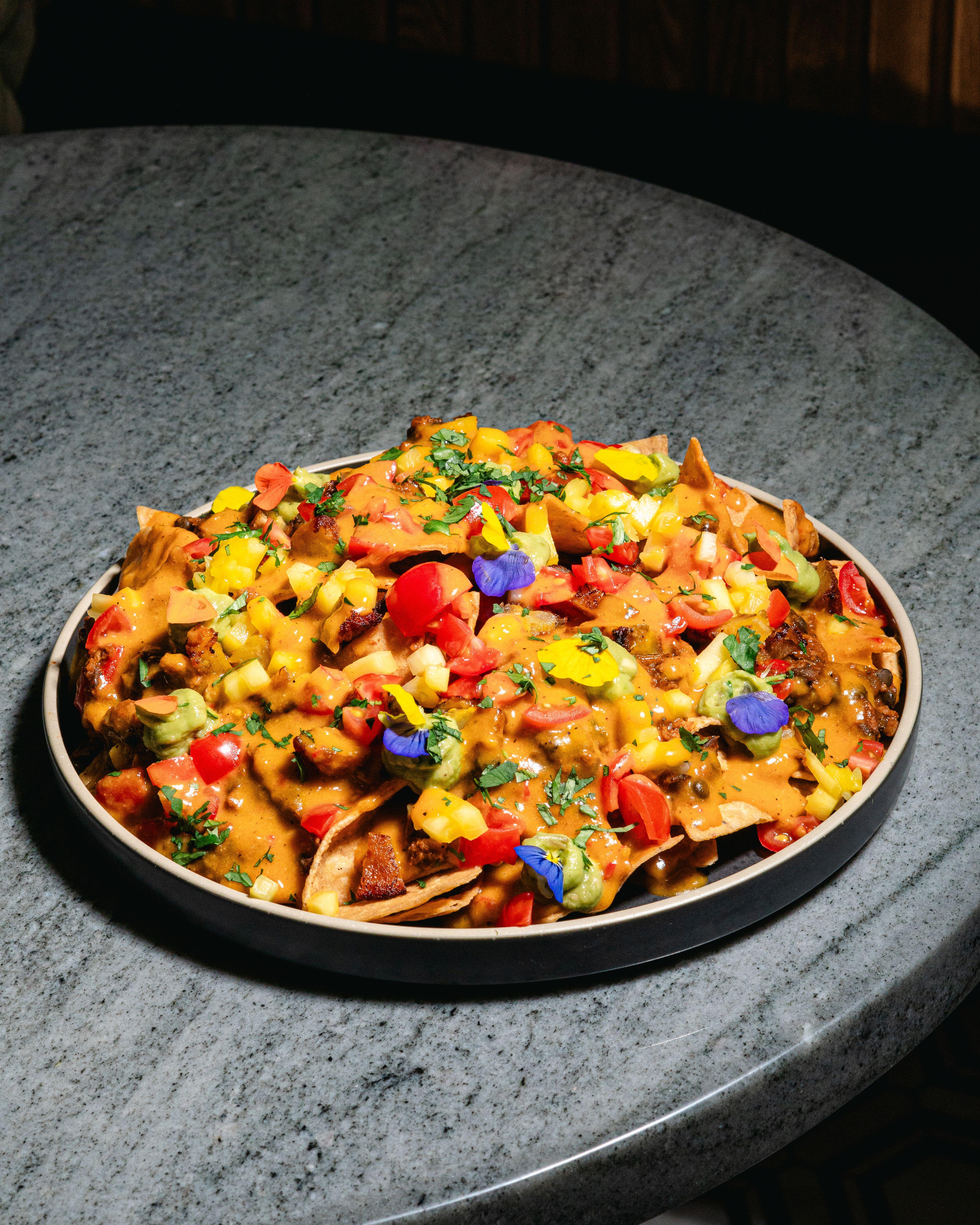Crisp tortilla chips topped with house made pimento queso, beef, caramelized plantains, mango, tomatoes, guac, and fresh cilantro