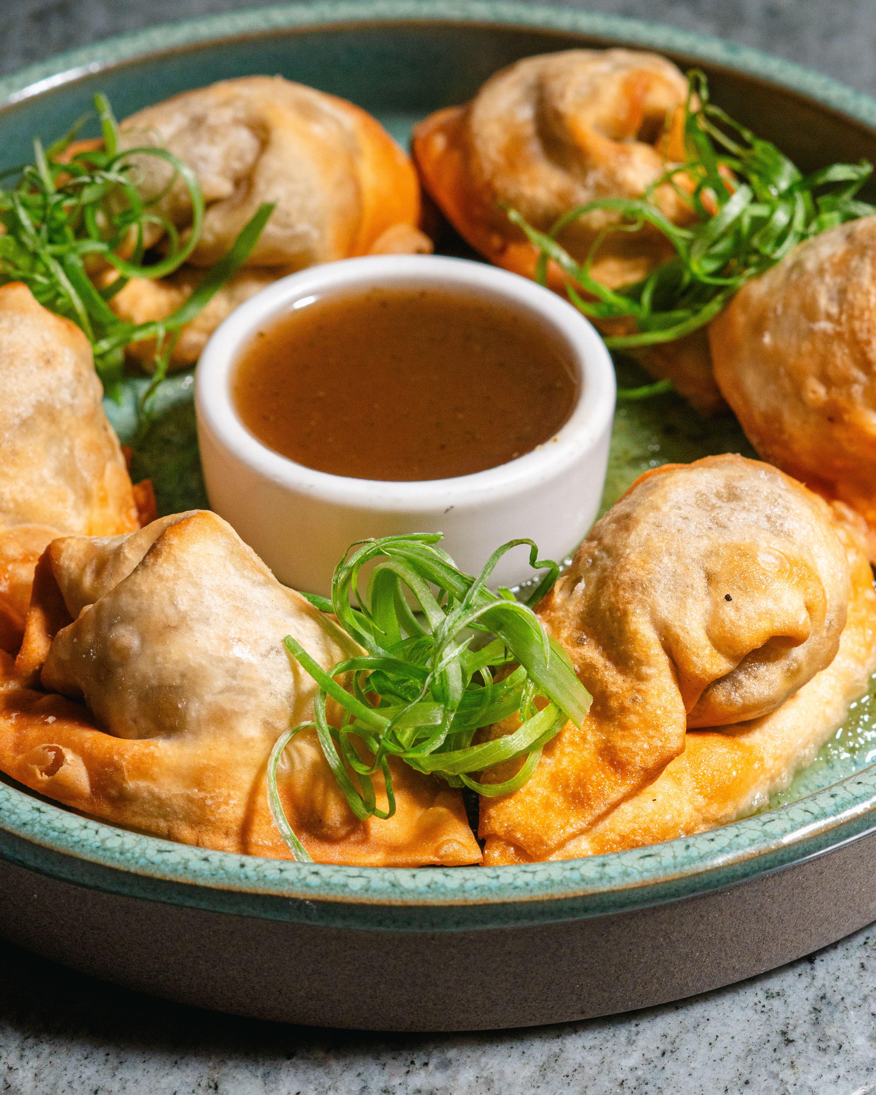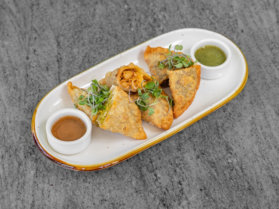 Golden crispy wontons filled with Curry Chikn, served with tamarind chutney & Cucumber Chutney
