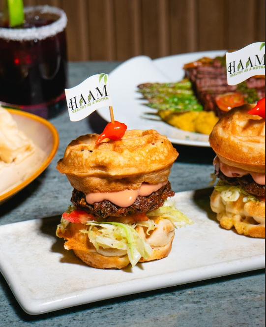 Dominican street style chimi served on waffles. Beef, shredded cabbage, tomato, onions and mayo-ketchup
