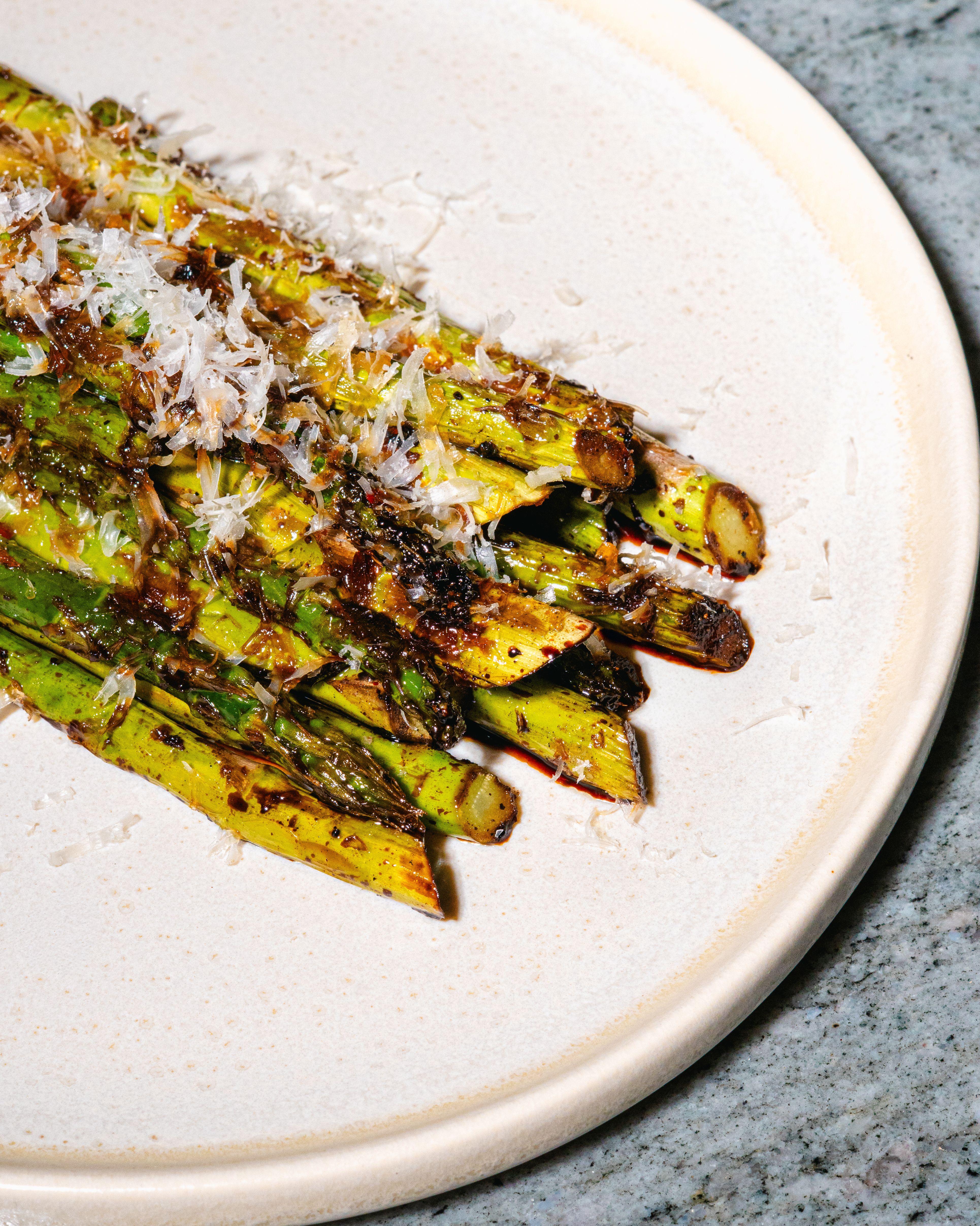 Charred miso glazed asparagus finished with a snowfall of shaved Parmesan.